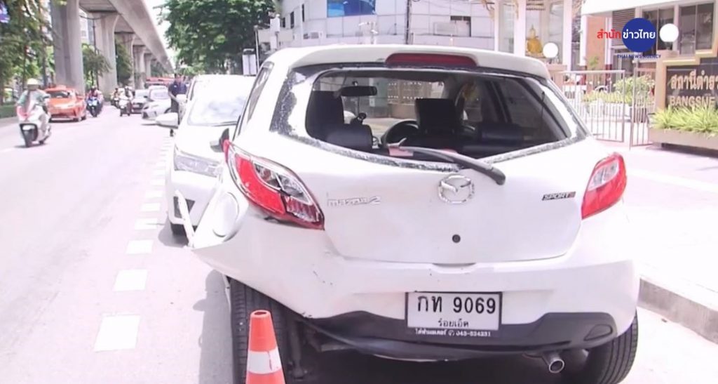 น.ส.พิชญา ลากูล เจ้าของรถยนต์ยี่ห้อมาสด้า 2 สีขาว ทะเบียน กท 9069 ร้อยเอ็ด หนึ่งในผู้เสียหายที่เข้าให้ปากคำกับตำรวจ พร้อมตรวจสอบสภาพรถยนต์ที่ได้รับความเสียหาย เล่าว่า กำลังขับรถมุ่งหน้าแยกรัชโยธิน ตรงห้าแยกลาดพร้าว แขวงจตุจักร เขตจตุจักร เพื่อกลับหอพัก จู่ๆ รถคันนี้ก็พุ่งมาชนท้ายอย่างแรง จนท้ายรถบุบ กระจกหลังแตกละเอียดทั้งหมด ได้รับบาดเจ็บฟกช้ำช่วงขาและเข่า ยอมรับว่าโกรธกับเหตุการณ์ที่เกิดขึ้น เพราะตนเพิ่งเรียนจบและได้งานต่างจังหวัด ต้องใช้รถคันนี้ขนของไปทำงานในวันศุกร์นี้ แต่รถกลับมาถูกชน ประกันแจ้งว่าต้องใช้เวลาซ่อมอย่างน้อย 20 วัน แม้ผู้ก่อหตุจะขอโทษและอ้างว่าเครียดก็ตาม แต่ทุกคนก็มีปัญหาเป็นของตัวเอง ไม่ควรทำแบบนี้. – สำนักข่าวไทย