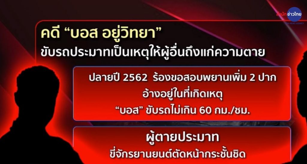 พร้อมย้ำครอบครัวผู้ตายสามารถฟ้องในข้อหาขับรถประมาทเลินเล่อ เป็นเหตุให้ ด.ต.วิเชียรถึงแก่ความตายได้ จากพยานหลักฐานเดิมที่มีอยู่แล้ว ซึ่งตอนแรกอัยการ “สั่งฟ้อง” แต่หลังพิจารณามา 8 ปี ก็กลับคำสั่งเดิมเป็น “สั่งไม่ฟ้อง” ด้วยเหตุผลหลักคือ ในตอนแรกเพราะผู้ตรวจสอบความเร็วให้การว่า “บอส” ขับรถด้วยความเร็ว 177 กม./ชม. แต่ภายหลังมีการร้องขอความเป็นธรรม ผู้ตรวจสอบความเร็วคนเดียวกันนี้ได้ให้การใหม่ในปี 2557 ว่าได้คำนวณใหม่แล้ว ความเร็วรถลดลงเหลือเพียง 79 กม./ชม. และเมื่อปลายปี 2562 ก็มีการร้องขอให้สอบพยานเพิ่มอีก 2 ปาก อ้างอยู่ในที่เกิดเหตุ ยืนยันตรงกันว่า “บอส” ไม่ได้ขับรถเร็วเกิน 60 กม./ชม. อุบัติเหตุเกิดขึ้นจากความประมาทของผู้ตายเพียงฝ่ายเดียว ที่ขี่รถจักรยานยนต์ตัดหน้า “บอส” อย่างกระชั้นชิด
