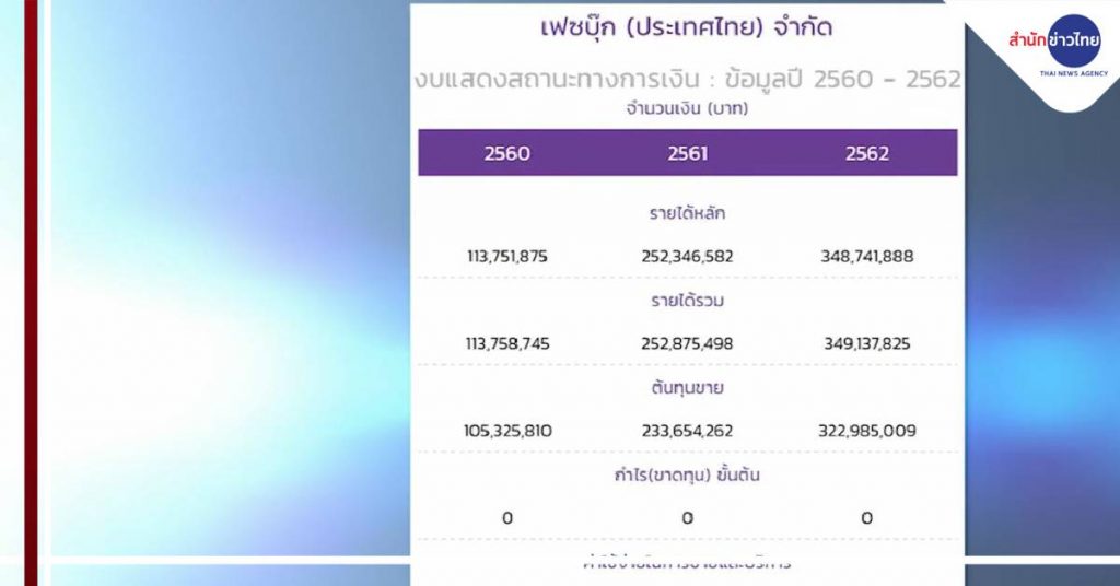 “เฟซบุ๊ก” ถือเป็นแพลตฟอร์มสื่อออนไลน์ ที่เข้ามาดำเนินธุรกิจและจดทะเบียนบริษัทในไทยตั้งแต่ปี 58 ทุนจดทะเบียนกว่า 108 ล้านบาท และมีผู้ใช้งานในไทยกว่า 50 ล้านคน มากเป็นอันดับต้นๆ ของโลก จึงเป็นตลาดผู้ใช้งานขนาดใหญ่ ทำให้ 3 ปีย้อนหลัง เฟซบุ๊กประเทศไทยมีรายได้รวมกว่า 700 ล้านบาท กำไรสุทธิกว่า 30 ล้านบาท และจ่ายภาษีเงินได้กว่า 22 ล้านบาท