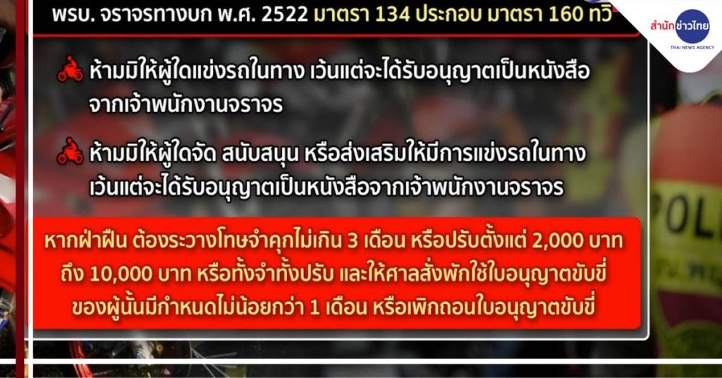 สำหรับการแข่งรถในทางสาธารณะ หรือสนับสนุน หรือส่งเสริมให้มีการแข่งรถในทาง ตาม พ.ร.บ.จราจรทางบก พ.ศ.2522 มีโทษจำคุกไม่เกิน 3 เดือน หรือปรับตั้งแต่ 2,000-10,000 บาท หรือทั้งจำทั้งปรับ และให้ศาลสั่งพักใช้ใบอนุญาตขับขี่ของผู้นั้นมีกำหนดไม่น้อยกว่า 1 เดือน หรือเพิกถอนใบอนุญาตขับขี่