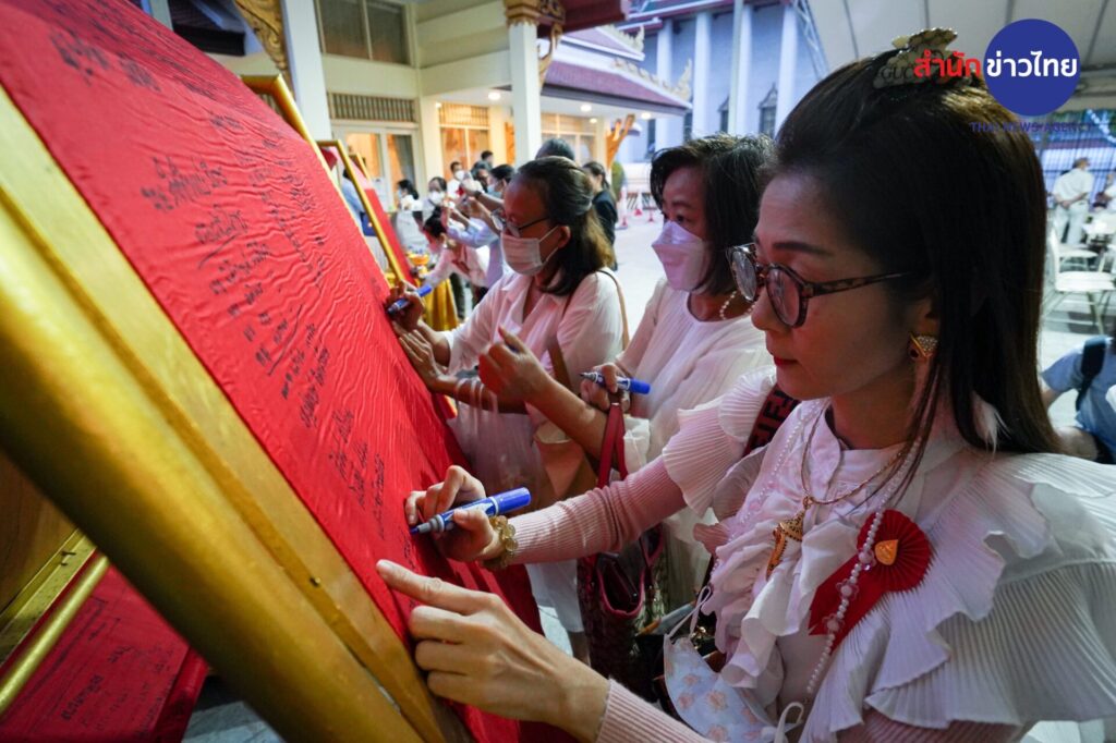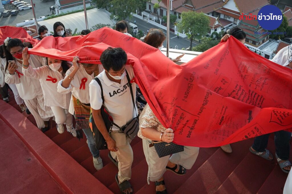 ซึ่งพิธีนี้เริ่มต้นตั้งแต่การร่วมจารึก ชื่อ-สกุล ลงบนผ้าแดง แล้วอัญเชิญผ้าแดงไปห่มองค์พระบรมบรรพต (ภูเขาทอง) ซึ่งทางวัดสระเกศได้เปิดให้ผู้เข้าร่วมงานได้ร่วมขบวนอัญเชิญผ้าแดงขึ้นไปห่มองค์พระธาตุภูเขาทอง เพื่อความเป็นสิริมงคล