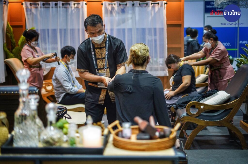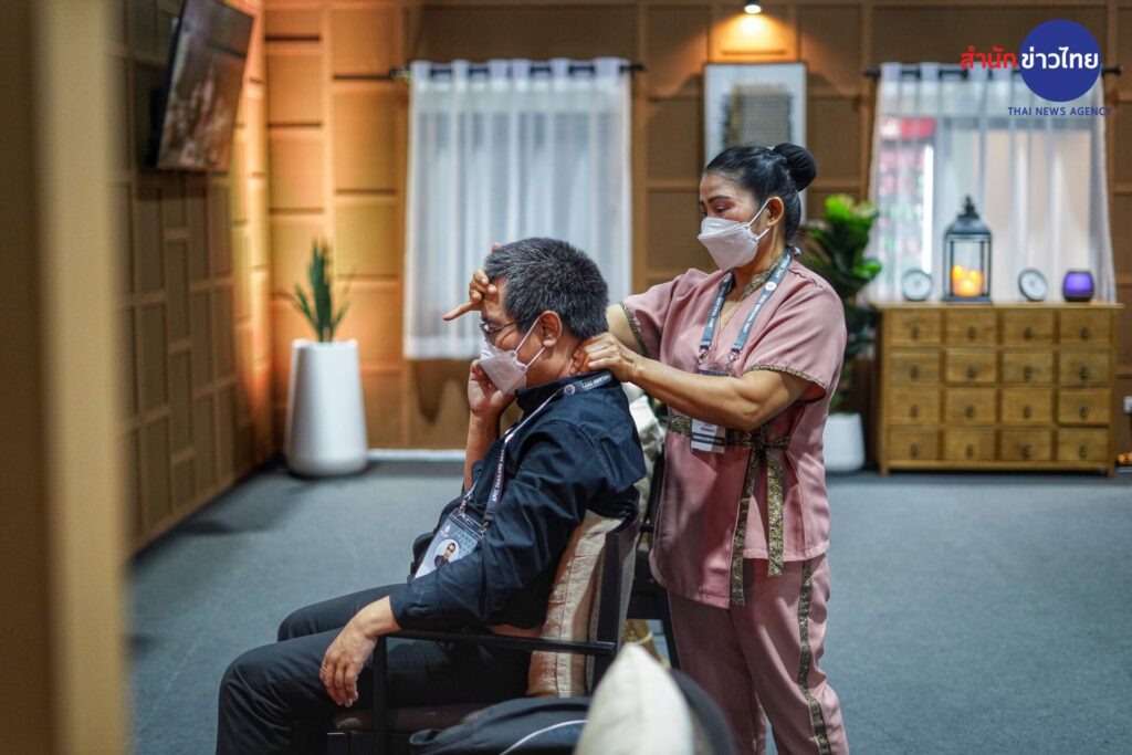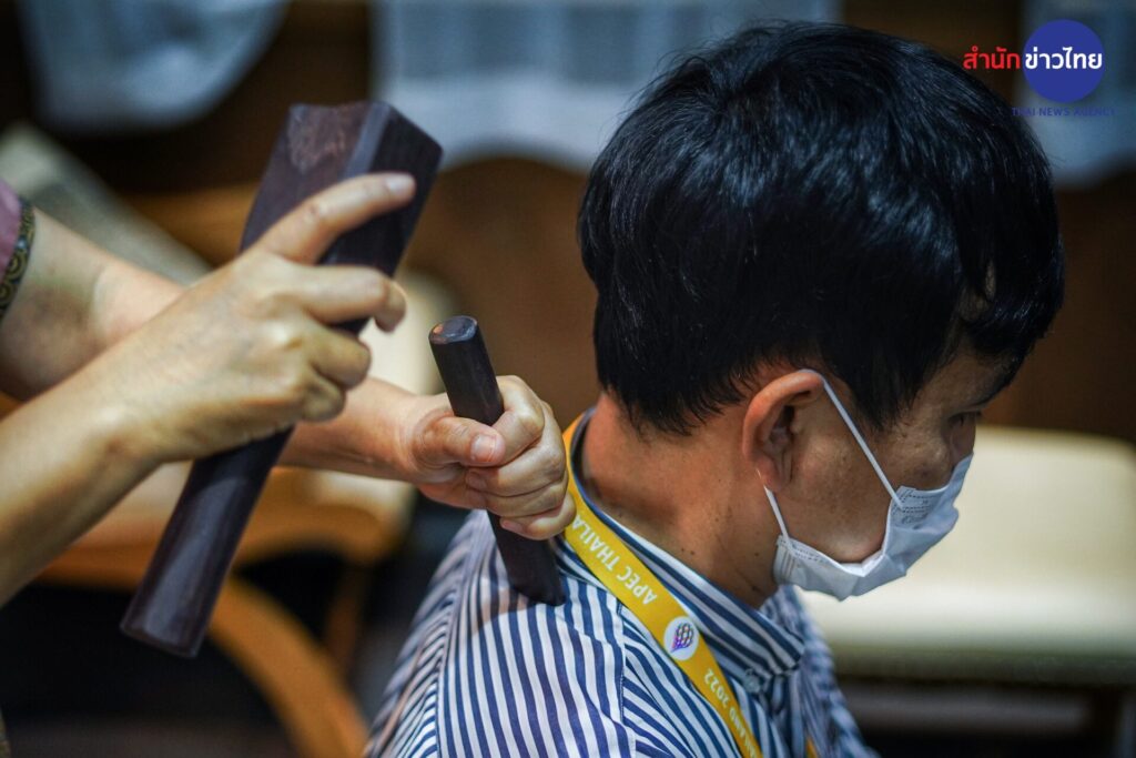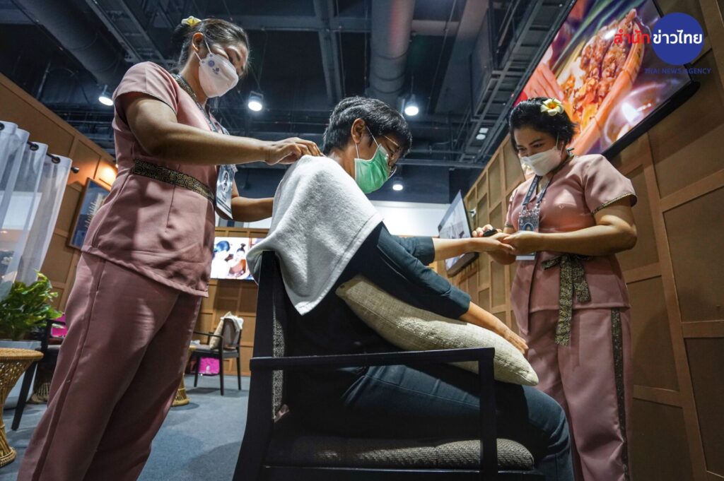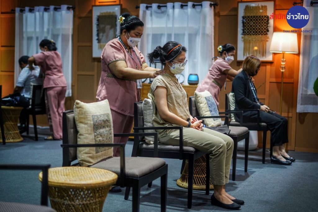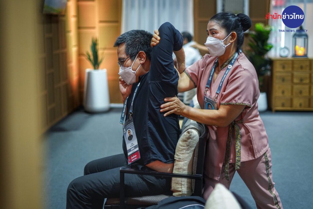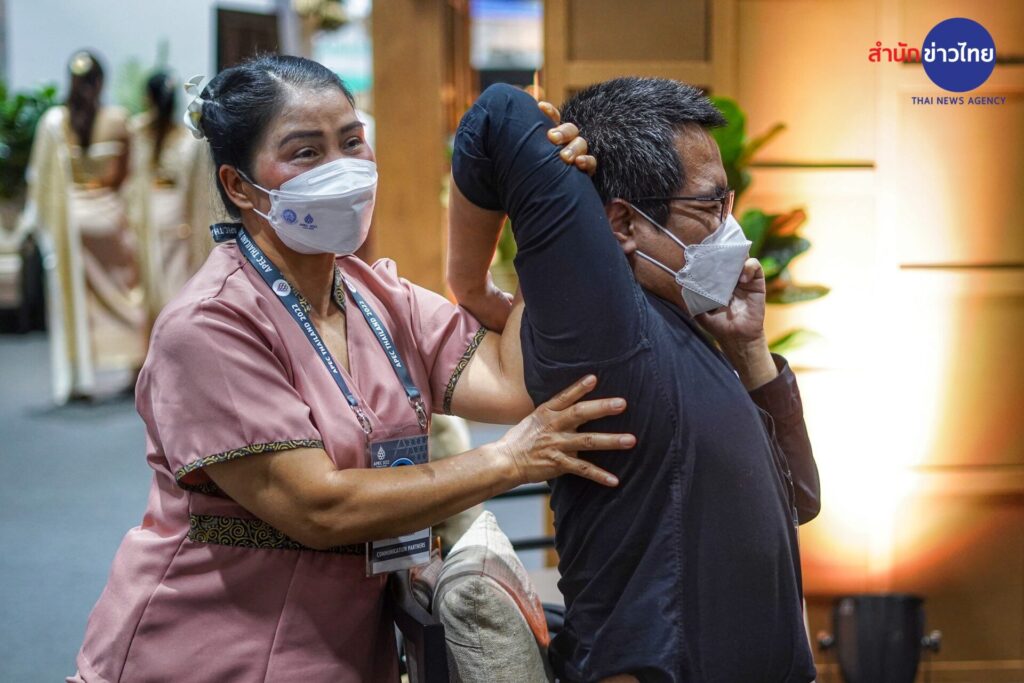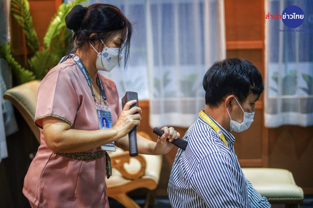 บูธนวดไทย ของกรมพัฒนาฝีมือแรงงานกระทรวงแรงงาน ที่จัดบริการนวดแผนไทย คอ บ่า ไหล่ ให้กับสื่อมวลชนทั้งไทยและต่างประเทศในการประชุมเอเปคครั้งนี้ การนวดแผนไทยถือเป็น Soft Power อย่างหนึ่งที่จะช่วยประชาสัมพันธ์ประเทศ ซึ่งมีสื่อต่างประเทศและสื่อไทย ลงทะเบียนขอรับบริการนวดแผนไทยเป็นจำนวนมากต่อวัน