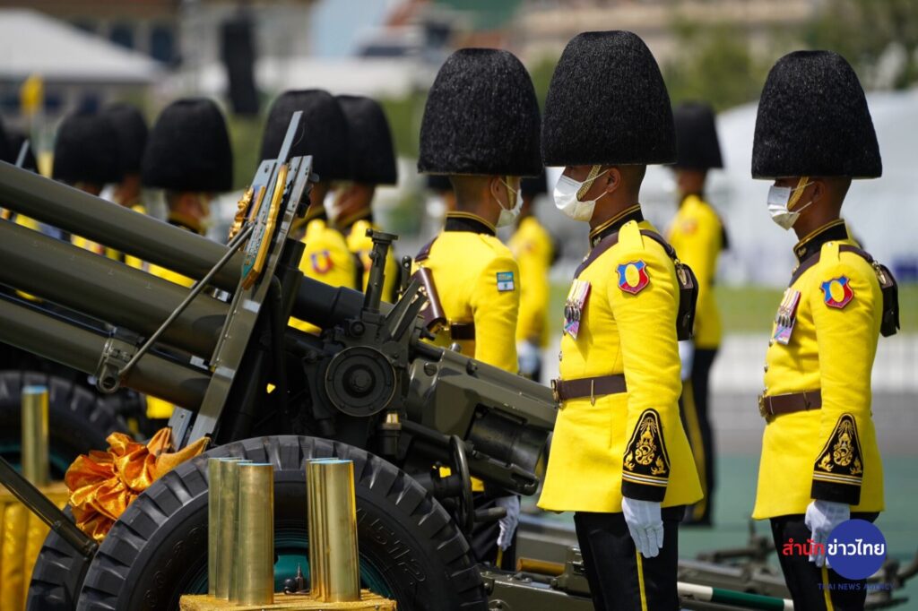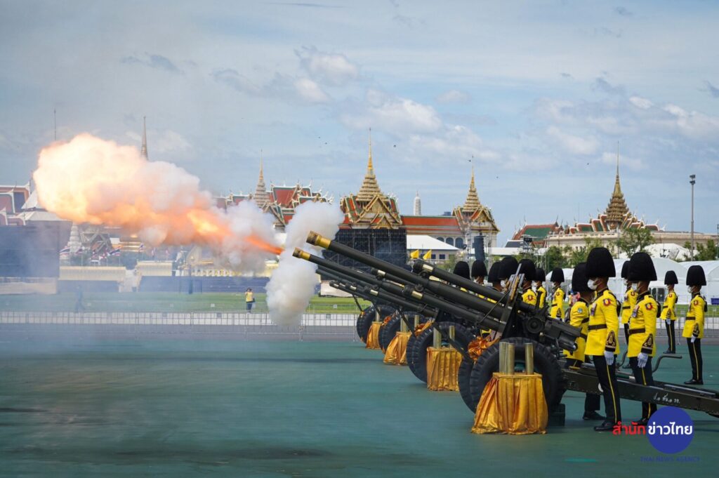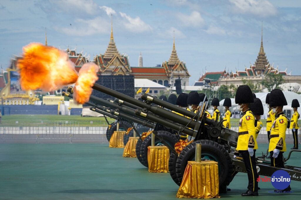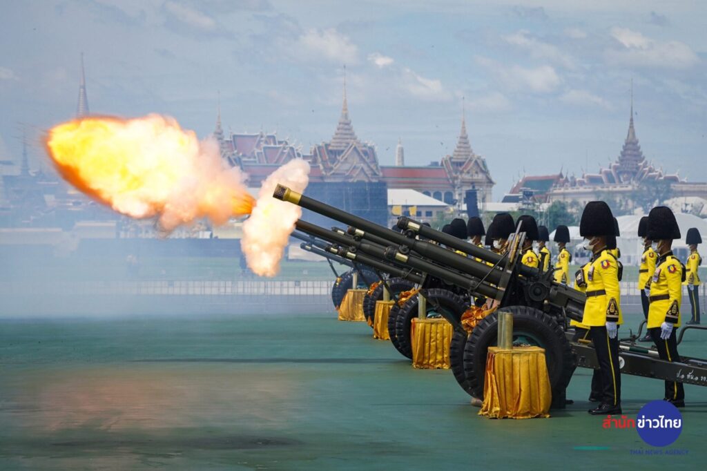 กองพันทหารปืนใหญ่ที่ 1 กรมทหารปืนใหญ่ที่ 1 รักษาพระองค์ ทำพิธียิงสลุตหลวง จำนวน 21 นัด เฉลิมพระเกียรติพระบาทสมเด็จพระเจ้าอยู่หัว เนื่องในโอกาสวันเฉลิมพระชนมพรรษา 71 พรรษา ในวันที่ 28 กรกฎาคม 2566 ณ มณฑลพิธีท้องสนามหลวง
