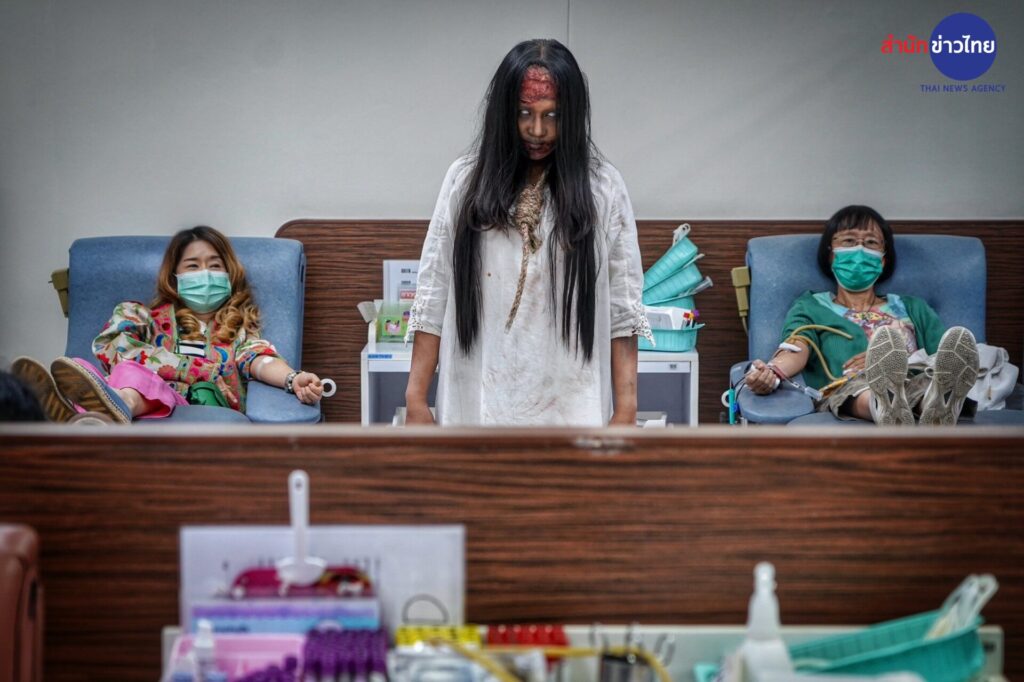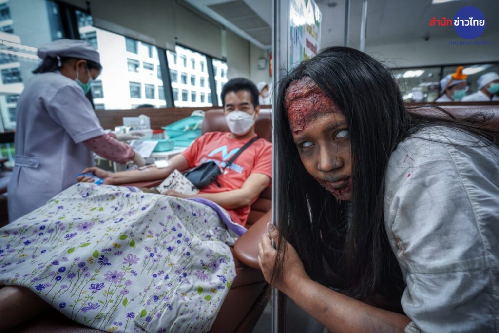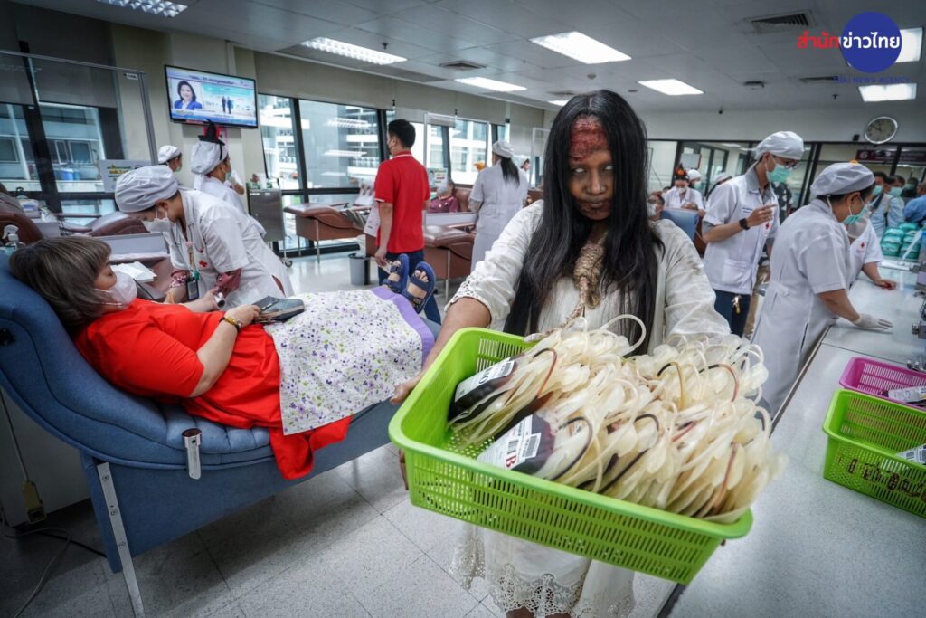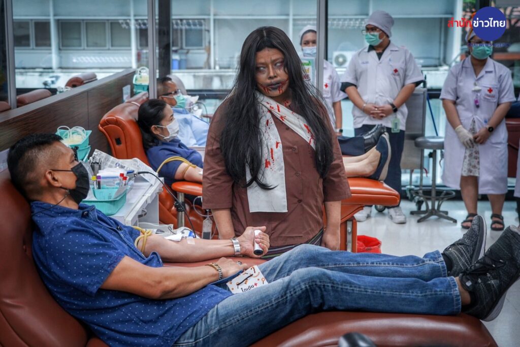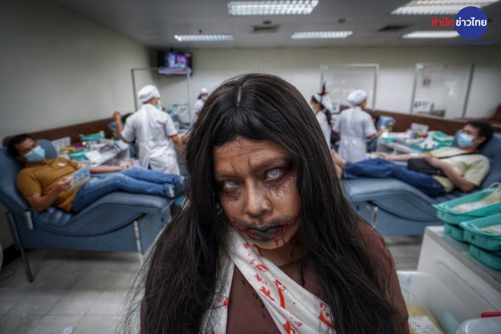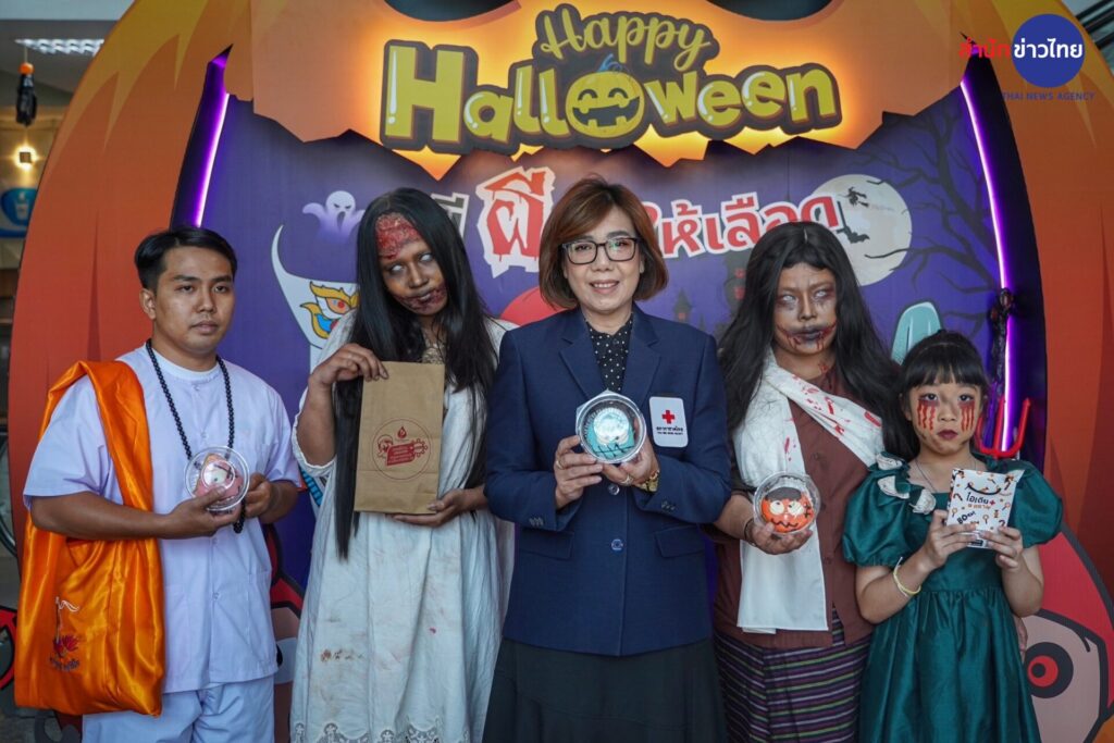 รองศาสตราจารย์ แพทย์หญิงดุจใจ ชัยวานิชศิริ ผู้อำนวยการศูนย์บริการโลหิตแห่งชาติ สภากาชาดไทย เปิดเผยว่า วันฮาโลวีน ตรงกับวันที่ 31 ตุลาคมของทุกปี ในต่างประเทศนิยมจัดงานเฉลิมฉลองและ ร่วมสังสรรค์กันอย่างสนุกสนาน ซึ่งในวันนี้จะมีการแต่งกายแฟนตาซีผีในรูปแบบต่างๆ พร้อมกิจกรรม“Trick or Treat” หลอกหรือเลี้ยง เพื่อขอขนมหรือลูกกวาดตามบ้านเรือนต่างๆ สำหรับประเทศไทยได้รับวัฒนธรรมมาประยุกต์ เพื่อร่วมสนุกกับเทศกาลนี้อย่างแพร่หลาย และจากประวัติของวันฮาโลวีน คือ การทำบุญของชาวคริสต์ ซึ่งสอดคล้อง กับการทาบุญของคนไทย ศูนย์บริการโลหิตแห่งชาติ จึงจัดกิจกรรมฉลองวันปล่อยผีเทศกาลวันฮาโลวีน ชวนผู้บริจาคโลหิตและประชาชน ทั่วไปมาบริจาคโลหิต กับโครงการ “ฮาโลวีน หนีผีมาให้เลือด” ระหว่างวันที่ 29-31 ตุลาคม 2566 สร้างกระแส การบริจาคโลหิตในเทศกาลฮาโลวีน ด้วยการบริจาคโลหิต เพื่อสำรองโลหิตคงคลังสาหรับผู้ป่วยทั่วประเทศ ซึ่งภายในงาน จะพบกับกิจกรรมบริจาคโลหิต และการแต่งกายแฟนซีผีนานาชาติจากเจ้าหน้าที่ เพื่อสร้างสีสัน สร้างบรรยากาศและ ความประทับใจให้แก่ผู้บริจาคโลหิต นอกจากนี้ยังมีการตกแต่งสถานที่ไว้ให้ผู้บริจาคโลหิตได้ถ่ายภาพเป็นที่ระลึกใน บรรยากาศน่ารักๆแบบผีๆ อีกด้วย