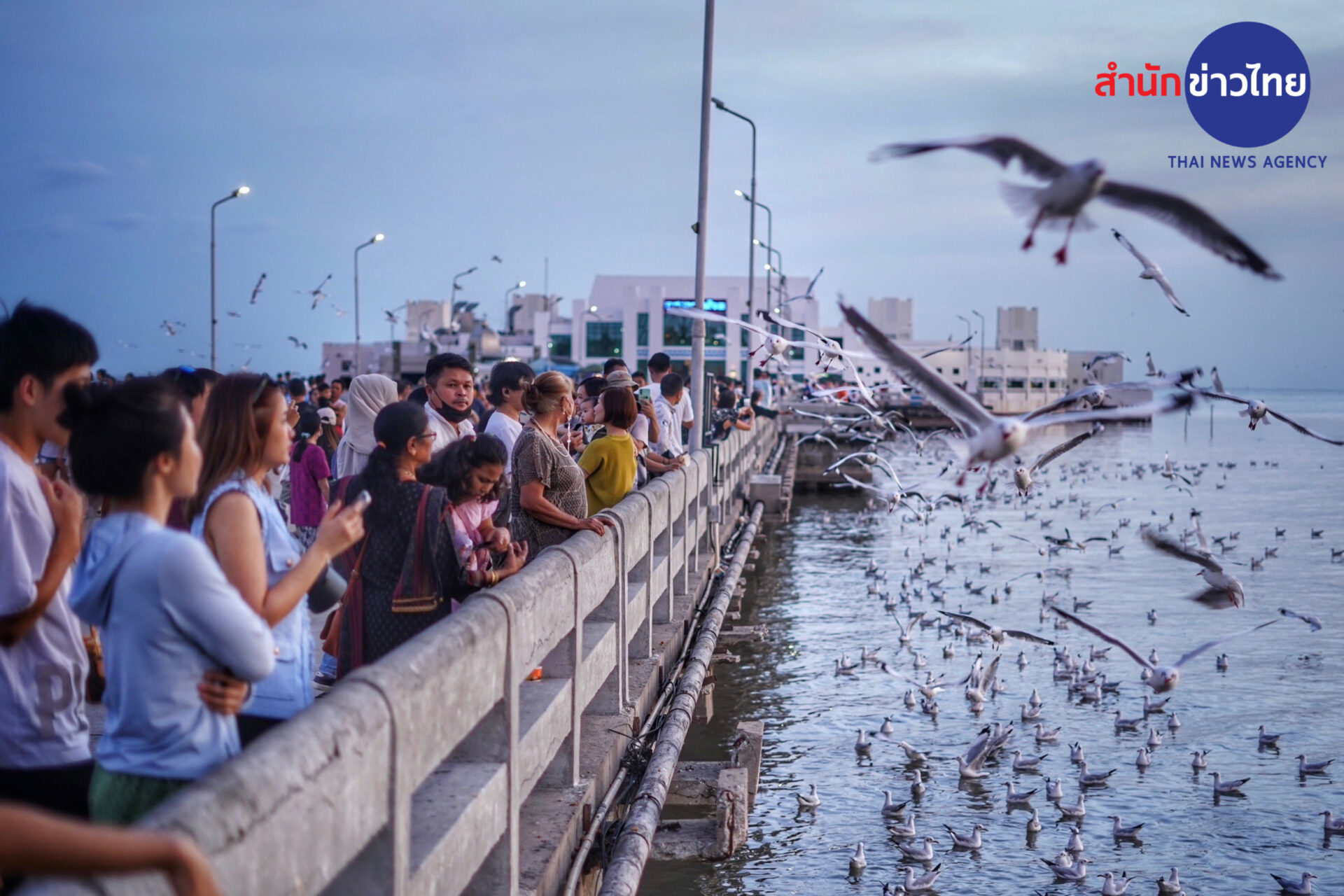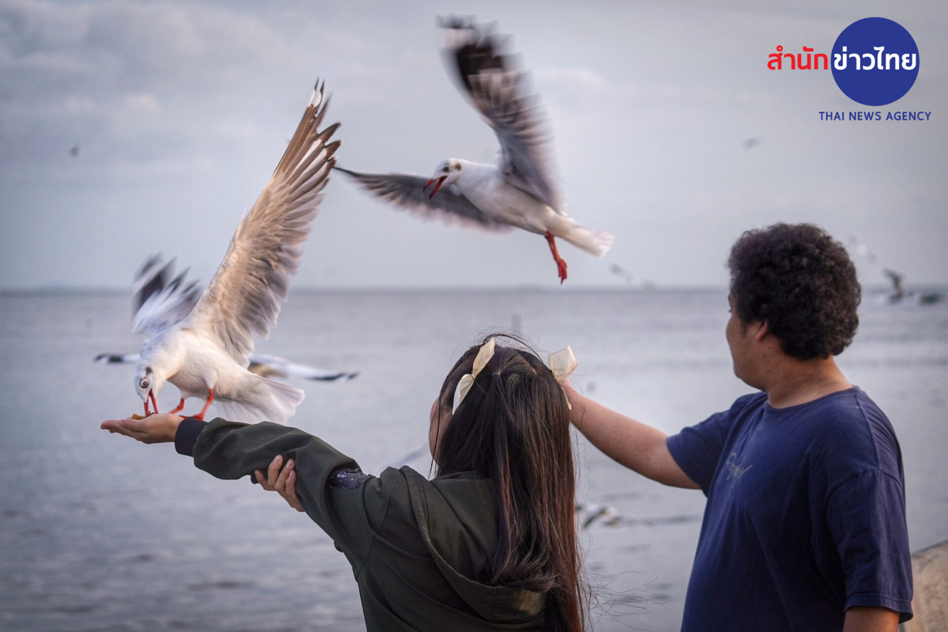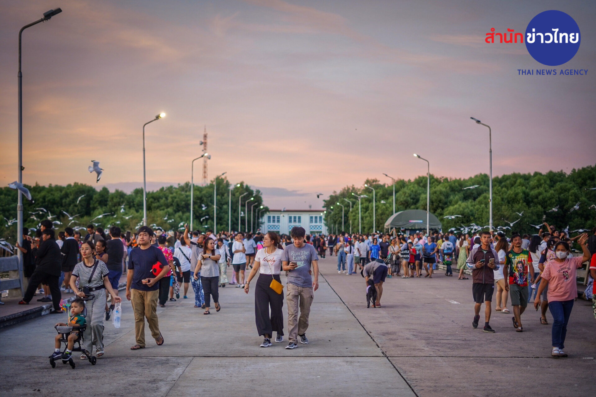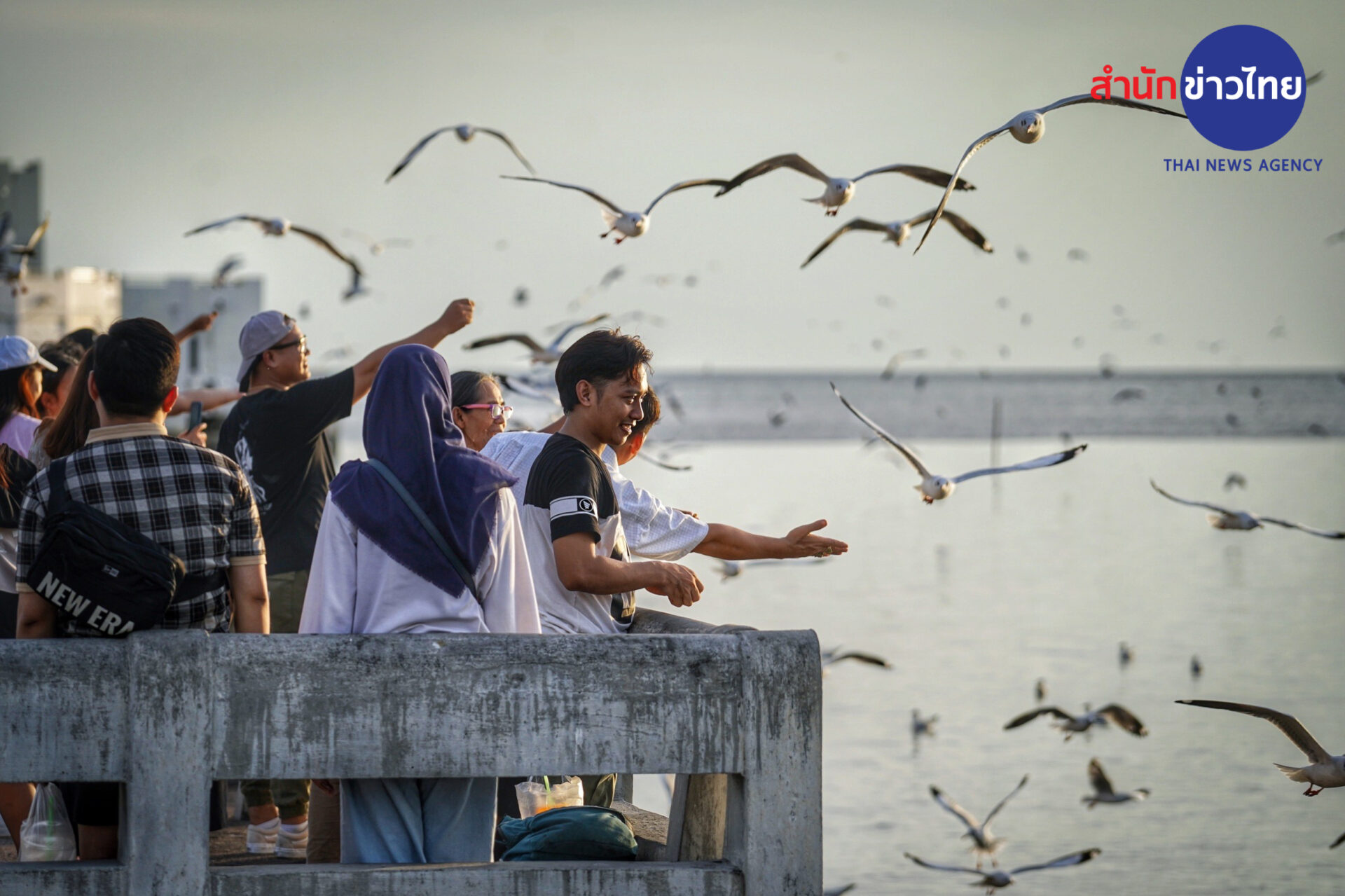 ประชาชนใช้เวลาพักผ่อนในช่วงวันหยุด ดูนกนางนวล ชมอาทิตย์ตกดิน ที่บางปู