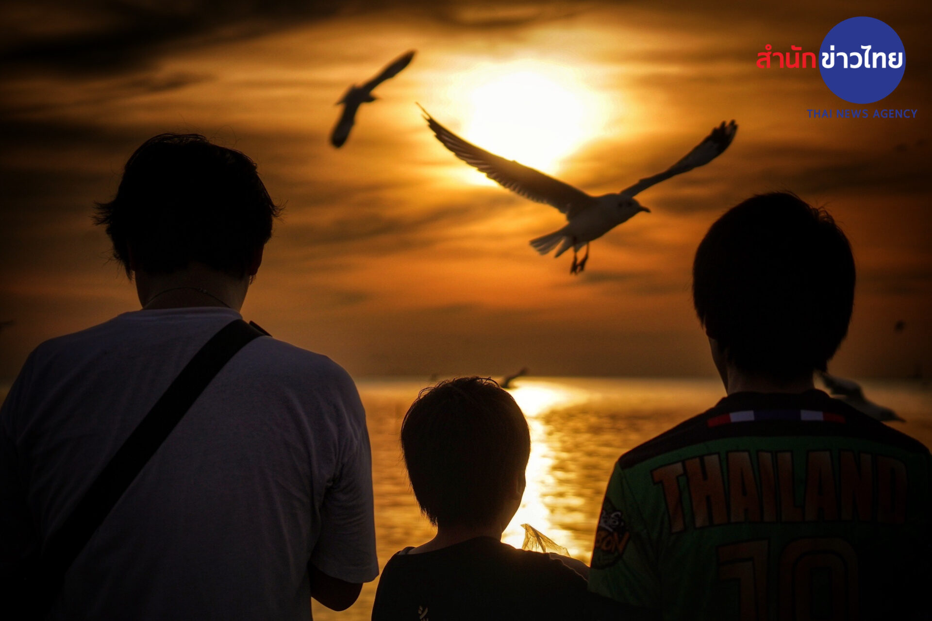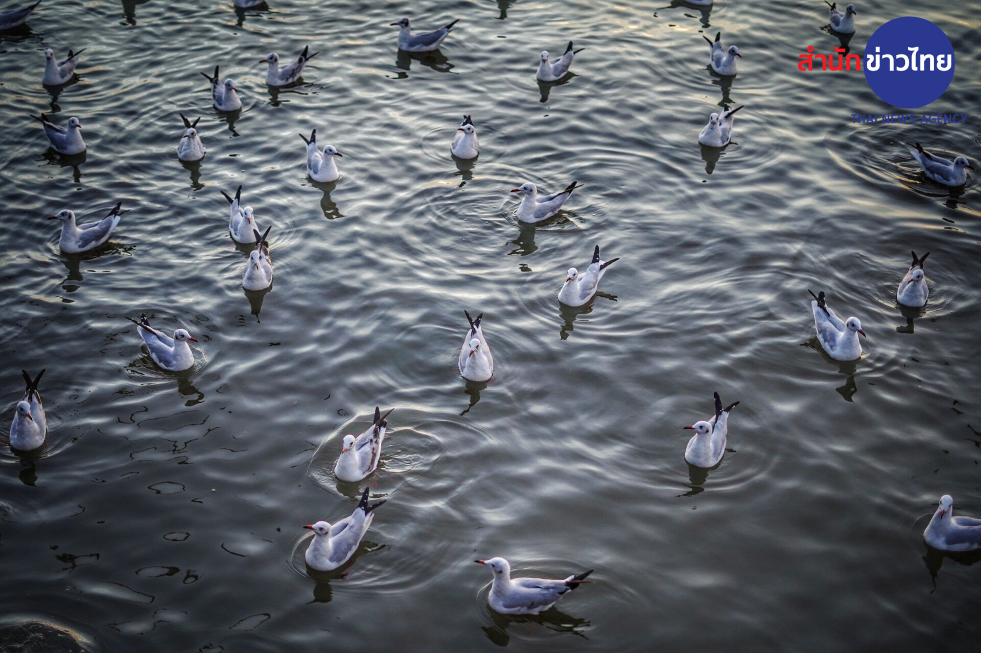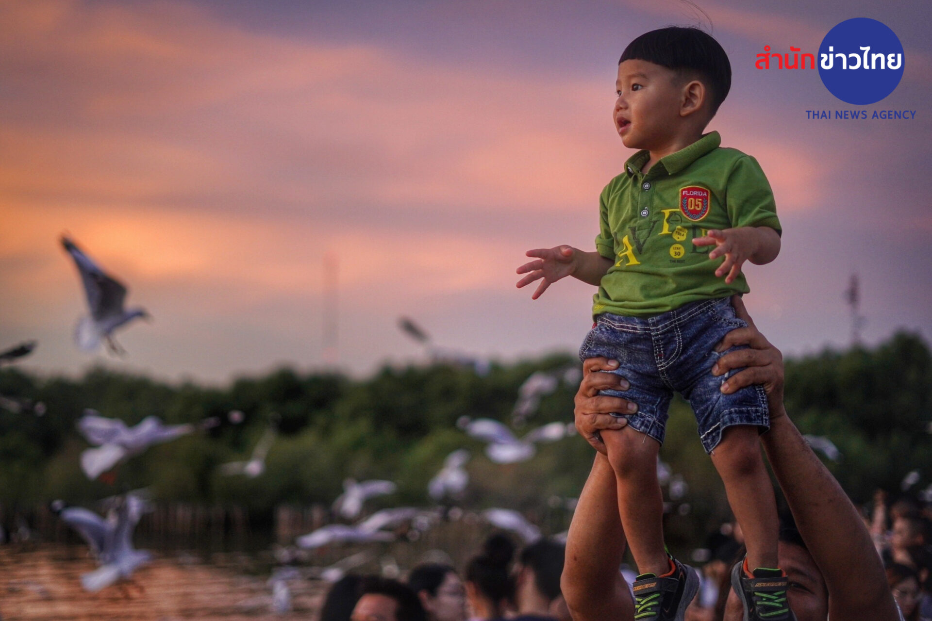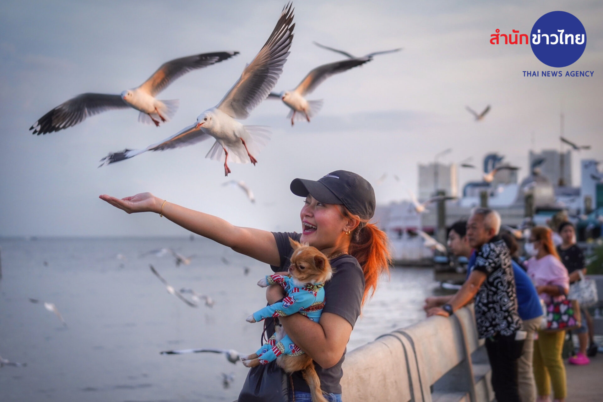 ประชาชนใช้เวลาพักผ่อนในช่วงวันหยุด ดูนกนางนวล ชมอาทิตย์ตกดิน ที่บางปู