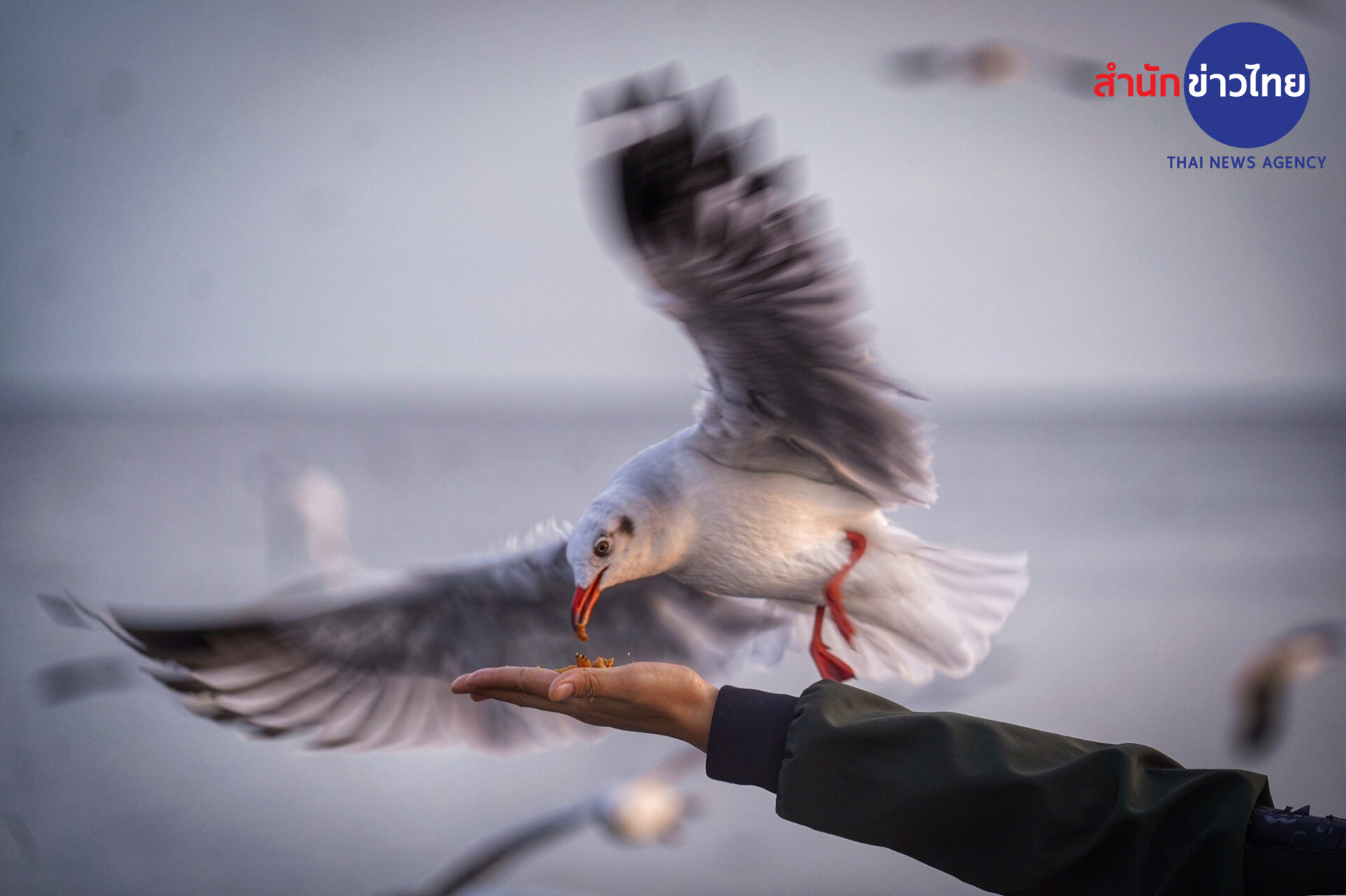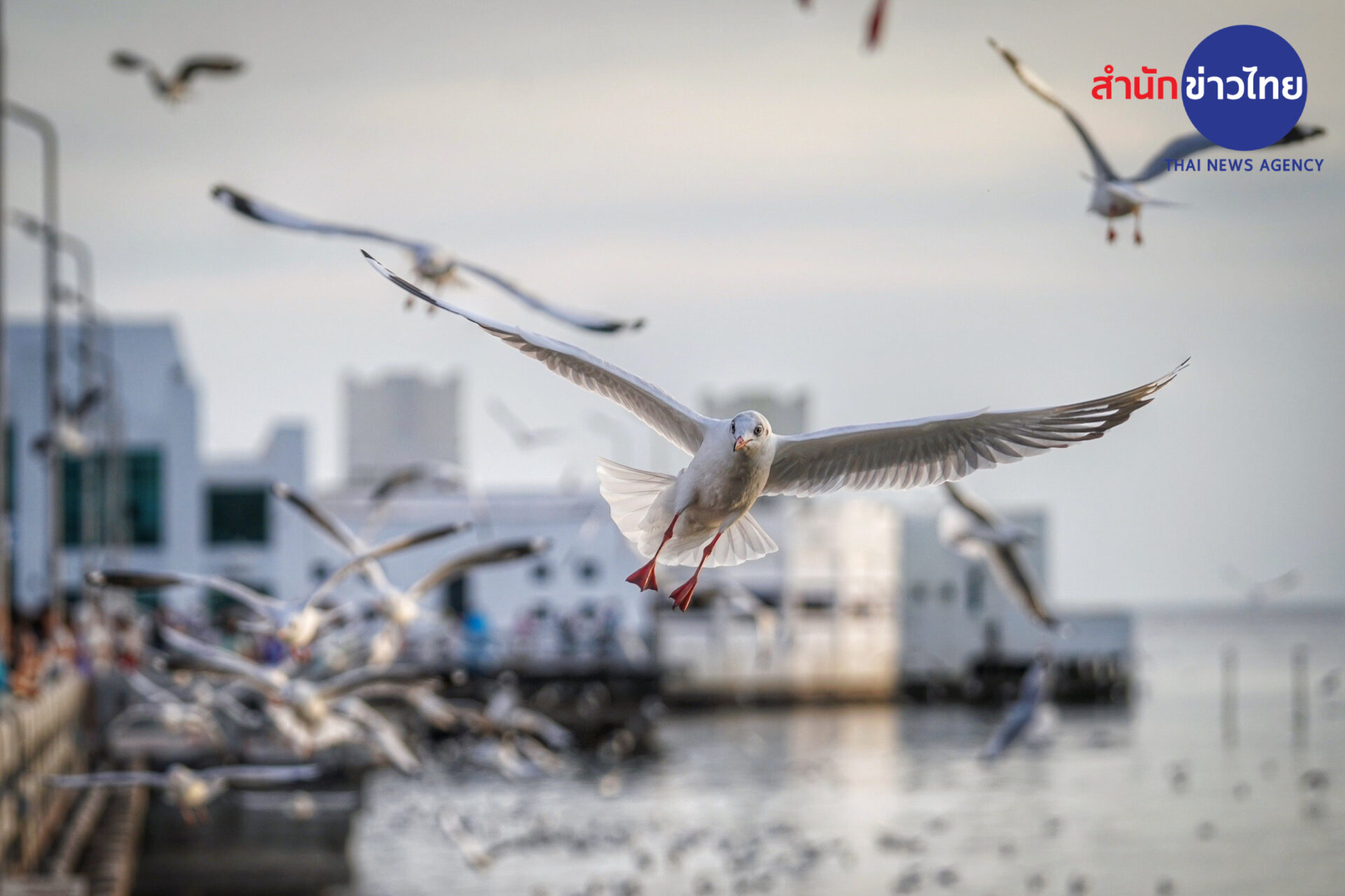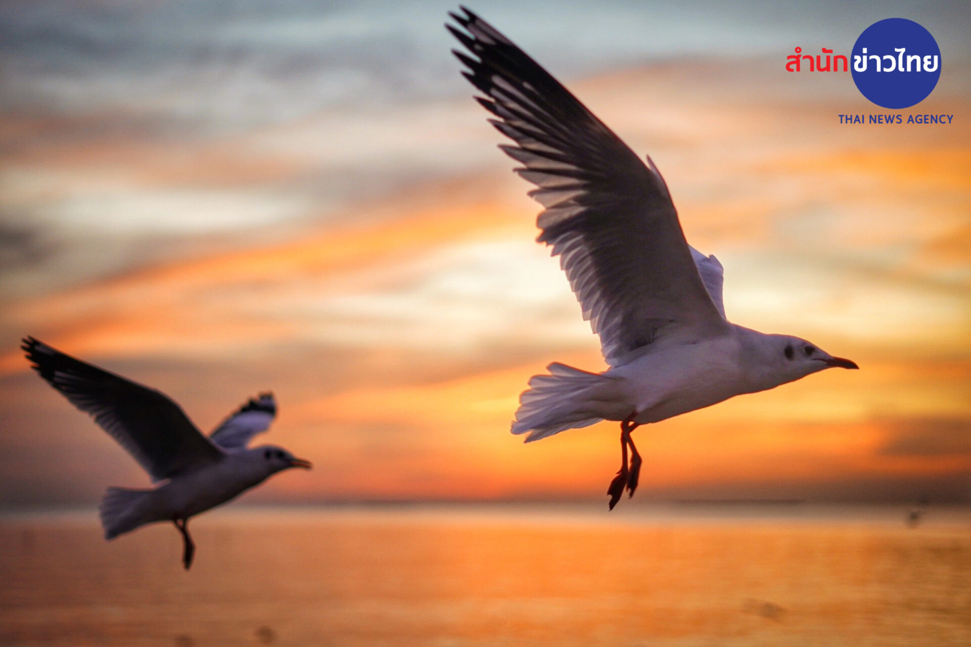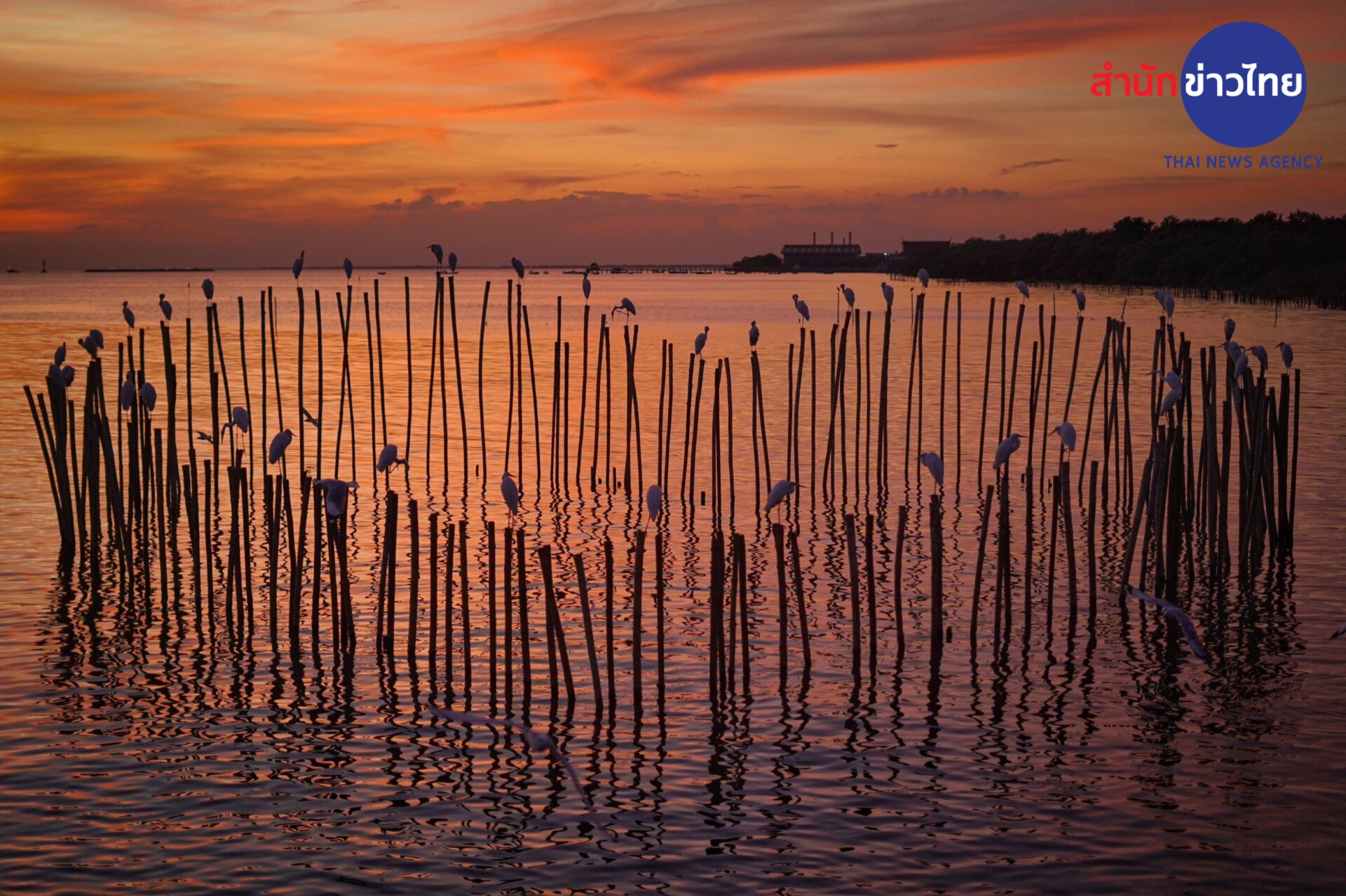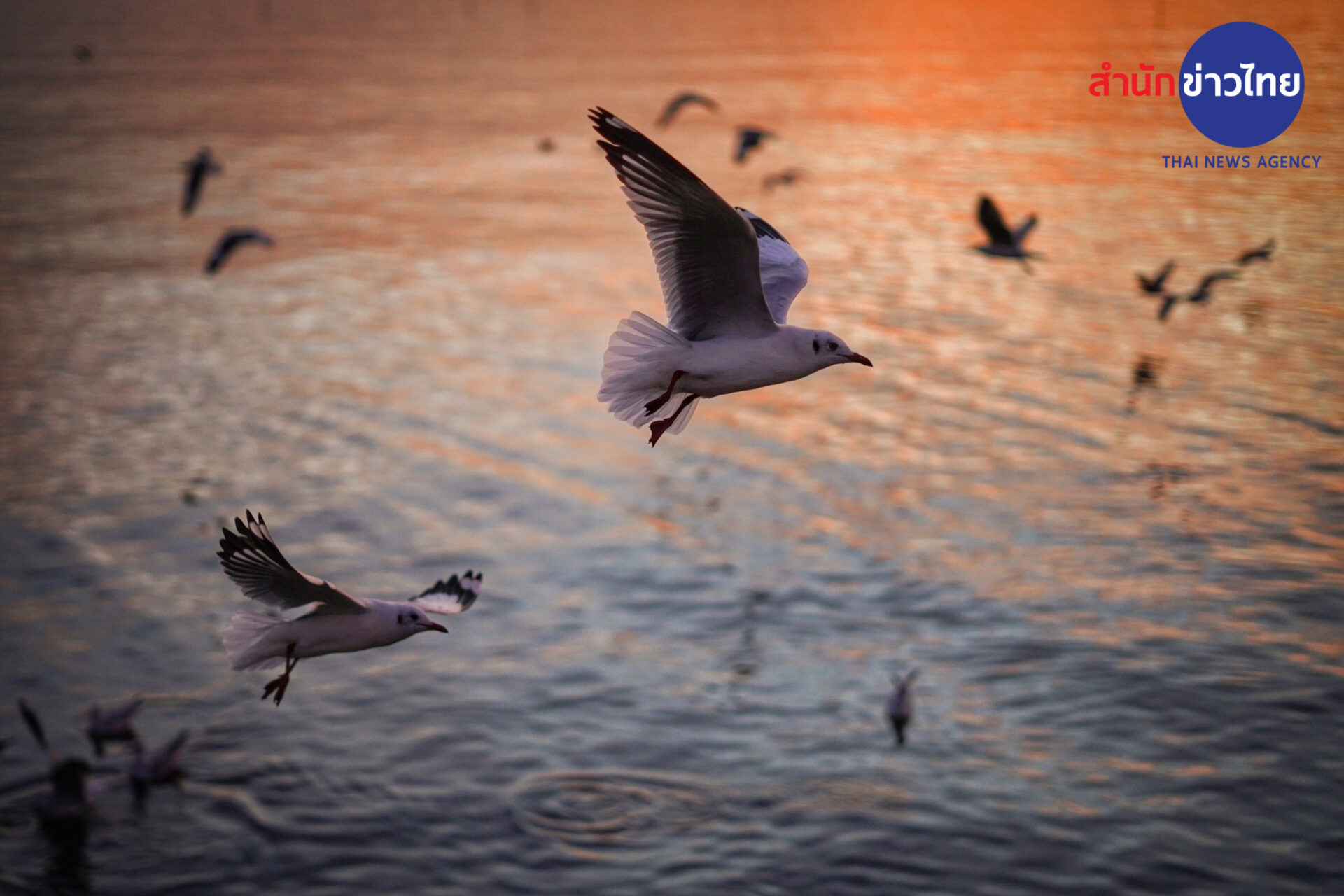 ประชาชนใช้เวลาพักผ่อนในช่วงวันหยุด ดูนกนางนวล ชมอาทิตย์ตกดิน ที่บางปู