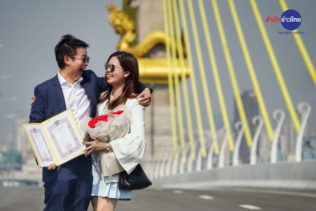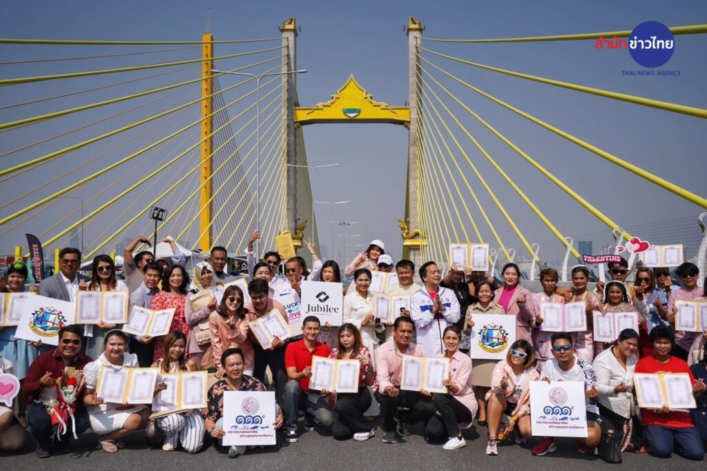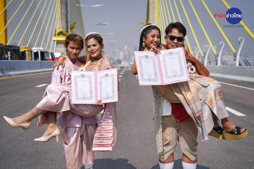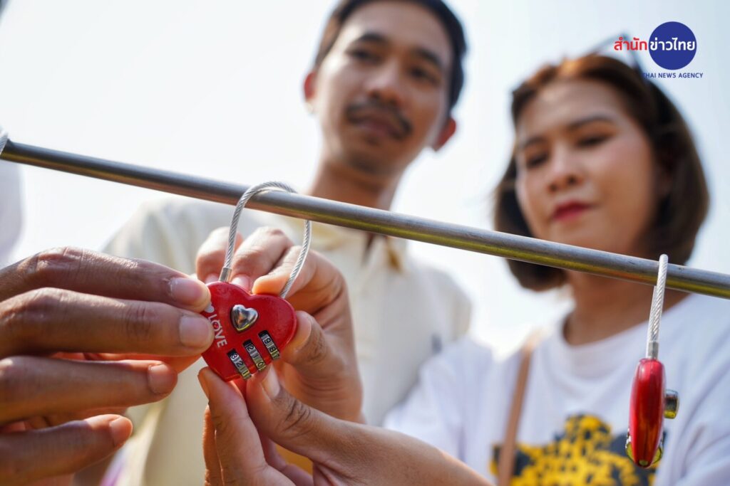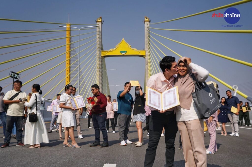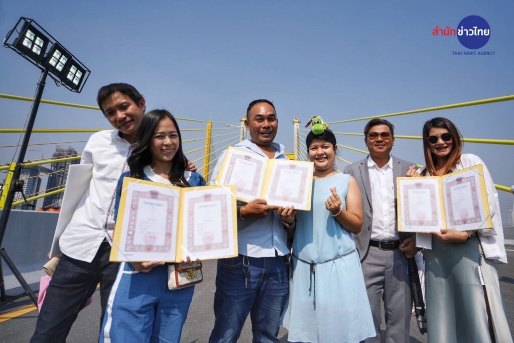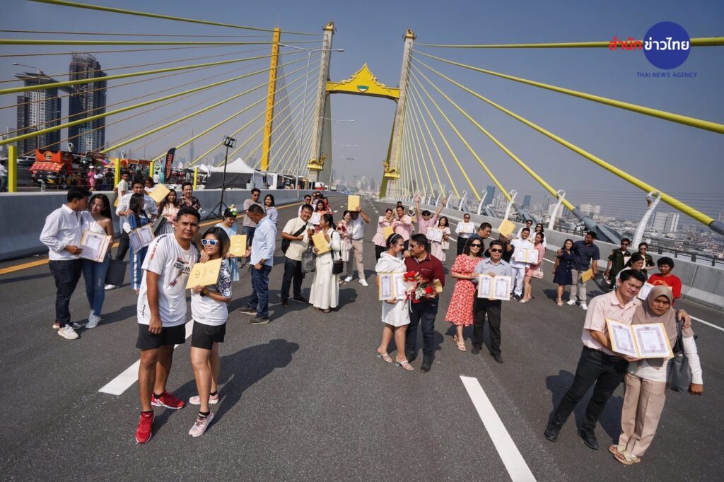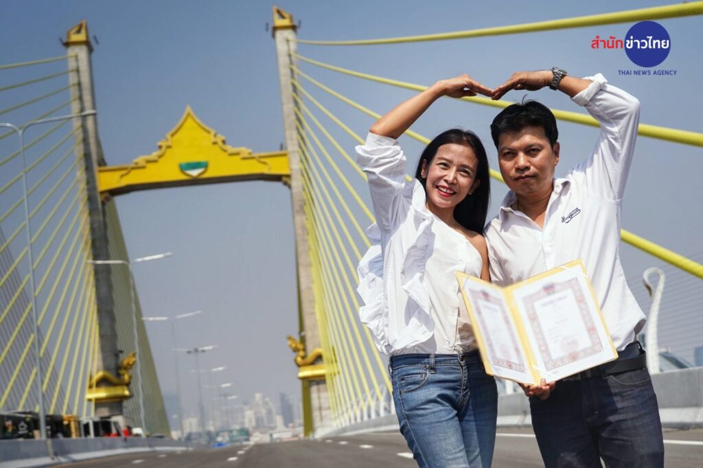 14 ก.พ.2567 การทางพิเศษแห่งประเทศไทย (กทพ.) ชวนคู่รักจดทะเบียนสมรสลอยฟ้าบนสะพานคู่ขนานสะพานพระราม 9 มหกรรมแห่งความสุข “Luck Lock Love รักล้นสะพาน” ซึ่งจัดขึ้นเป็นครั้งแรก บนสะพานคู่ขนานสะพานพระราม 9 ก่อนเปิดใช้งานจริงกลางปีนี้