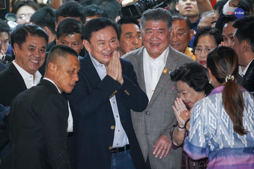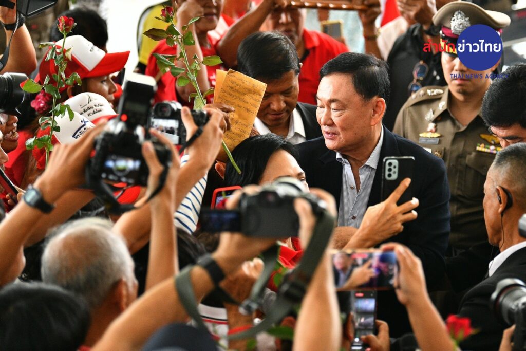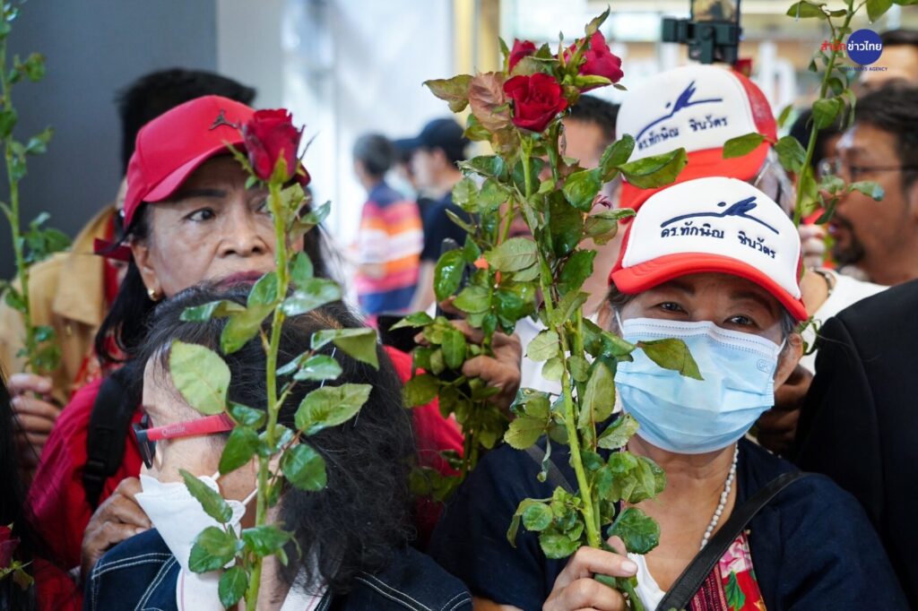 ทันทีที่ลงจากรถ นายทักษิณ รีบตรงเข้าไปหามวลชนที่มารอต้อนรับตั้งแต่ที่ทำการพรรคเพื่อไทย ท่ามกลางเสียงกรี๊ดและตะโกนดังสนั่นว่า “เรารักทักษิณ” ขณะที่ใบหน้าของนายทักษิณ ก็เต็มไปด้วยรอยยิ้ม และพยายามที่จะรับดอกกุหลาบจากมวลชนที่มารอต้อนรับ ขณะเดียวกันก็มีรัฐมนตรีของพรรคเพื่อไทย แกนนำและ สส.พรรคเพื่อไทย มารอต้อนรับด้วย