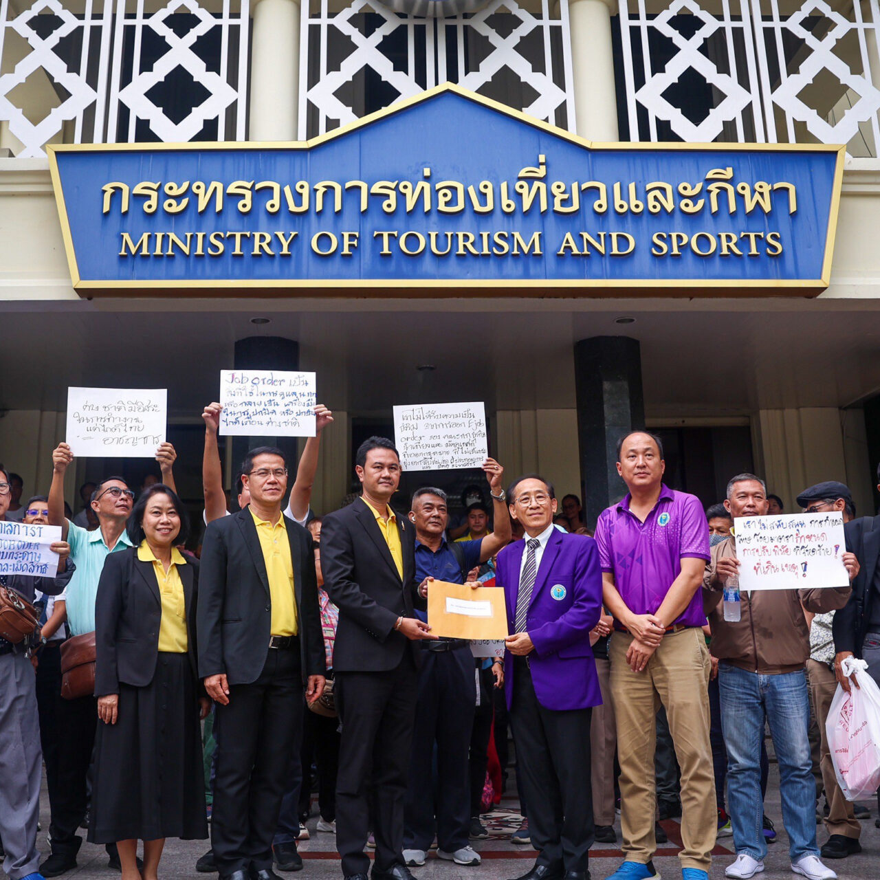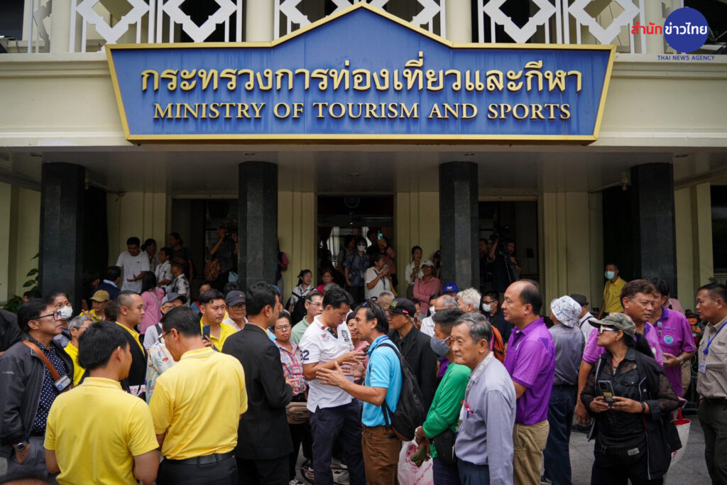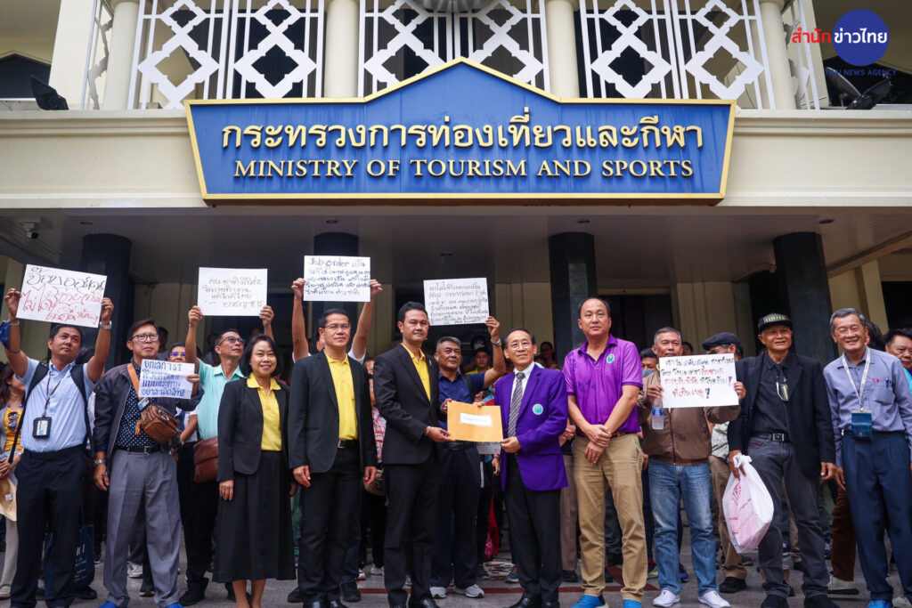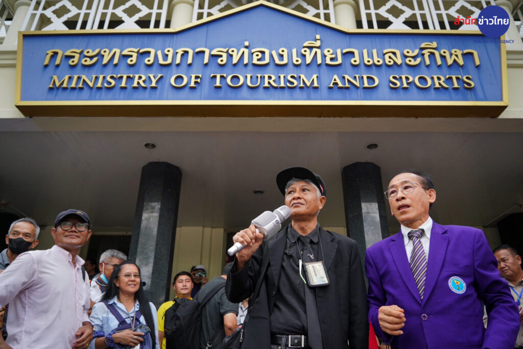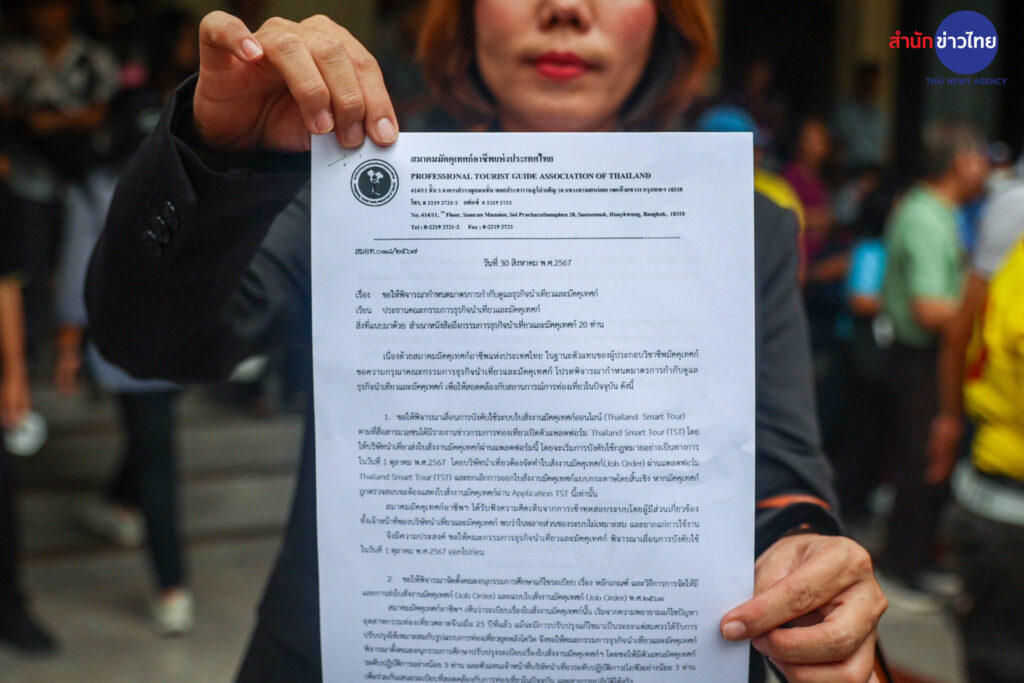 2 ก.ย.2567 บรรยากาศหน้ากระทรวงการท่องเที่ยวและกีฬา ถนนราชดำเนิน สมาคมมัคคุเทศก์อาชีพแห่งประเทศไทย พร้อมคณะกว่า 50 คน ยื่นหนังสือ ขอให้พิจารณากำหนดมาตรการกำกับดูแลธุรกิจนำเที่ยว และมัคคุเทศก์ให้สอดคล้องกับสถานการณ์การท่องเที่ยวในปัจจุบัน โดยมีข้อเรียกร้อง 3 ข้อ คือ