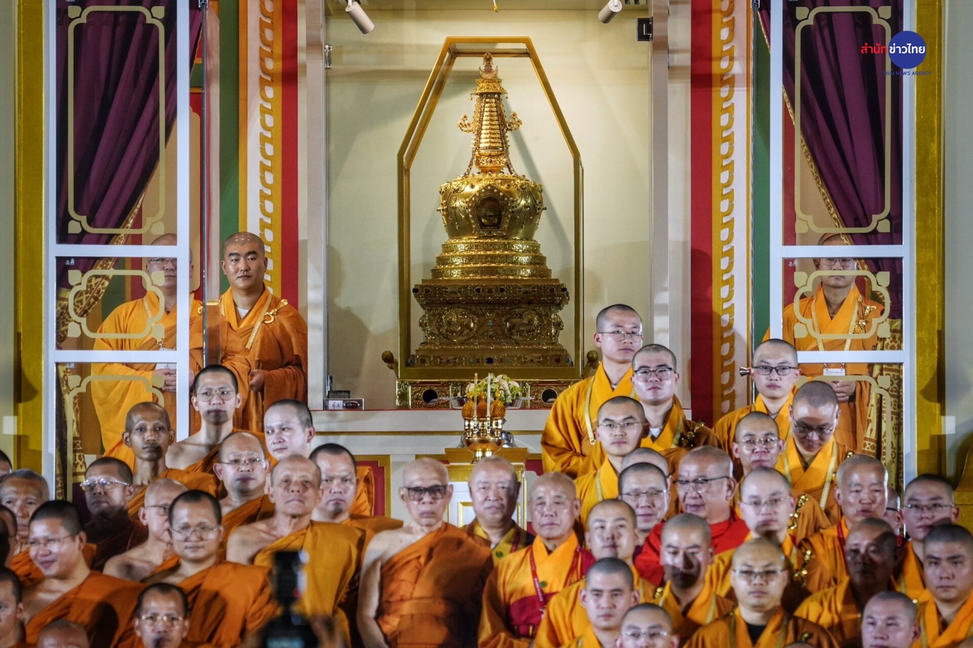 เมื่อขบวนเคลื่อนไปจนถึงบริเวณท้องสนามหลวง เจ้าหน้าที่อัญเชิญพระสถูปพระบรมสารีริกธาตุ (พระเขี้ยวแก้ว) ขึ้นประดิษฐานบนมณฑป โดยมีสมเด็จพระพุฒาจารย์ กรรมการมหาเถรสมาคม เจ้าอาวาสวัดไตรมิตรวิทยา เป็นประธานฝ่ายสงฆ์ ต่อมา น.ส.แพทองธาร เป็นประธานในพิธี พร้อมคณะรัฐมนตรี (ครม.) และผู้แทนทางการจีน ถวายพวงมาลัยสักการะพระบรมสารีริกธาตุ (พระเขี้ยวแก้ว) และมีคณะสงฆ์ฝ่ายจีน เจริญพระพุทธมนต์ร่วมกับคณะสงฆ์ฝ่ายไทย