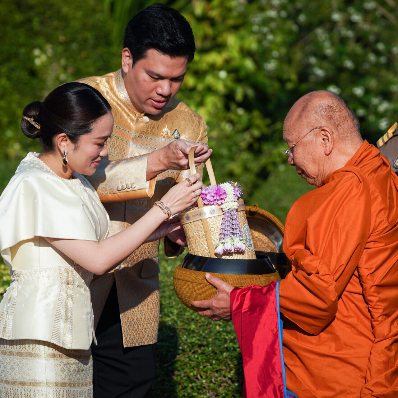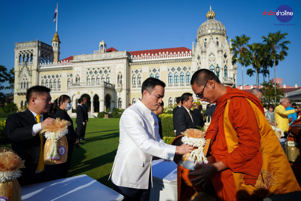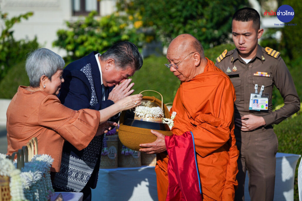 นายกรัฐมนตรีพร้อมคู่สมรส คณะรัฐมนตรีและคู่สมรส ร่วมทำบุญตักบาตร พระสงฆ์ 58 รูป สนามหญ้าหน้าตึกไทยคู่ฟ้า ซึ่งรวมพระสงฆ์ที่มาร่วมพิธีในวันนี้จำนวน 68 รูป จากนั้น นายกรัฐมนตรี ได้สักการะศาลพระพรหม บนตึกไทยคู่ฟ้า ก่อนสักการะศาลพระภูมิเจ้าที่ ศาลตา ศาลยาย สิ่งศักดิ์สิทธิ์ประจำทำเนียบรัฐบาล