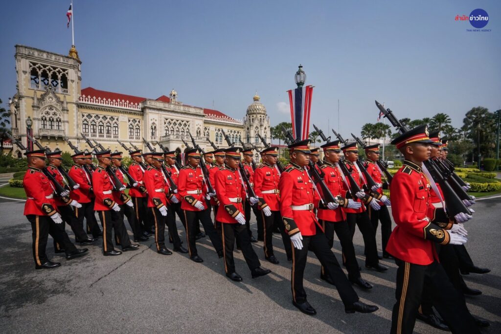 โดยผู้นำทั้ง 2 ประเทศร่วมตรวจแถวกองทหารเกียรติยศ บริเวณสนามหญ้าหน้าตึกไทยคู่ฟ้า ทำเนียบรัฐบาล