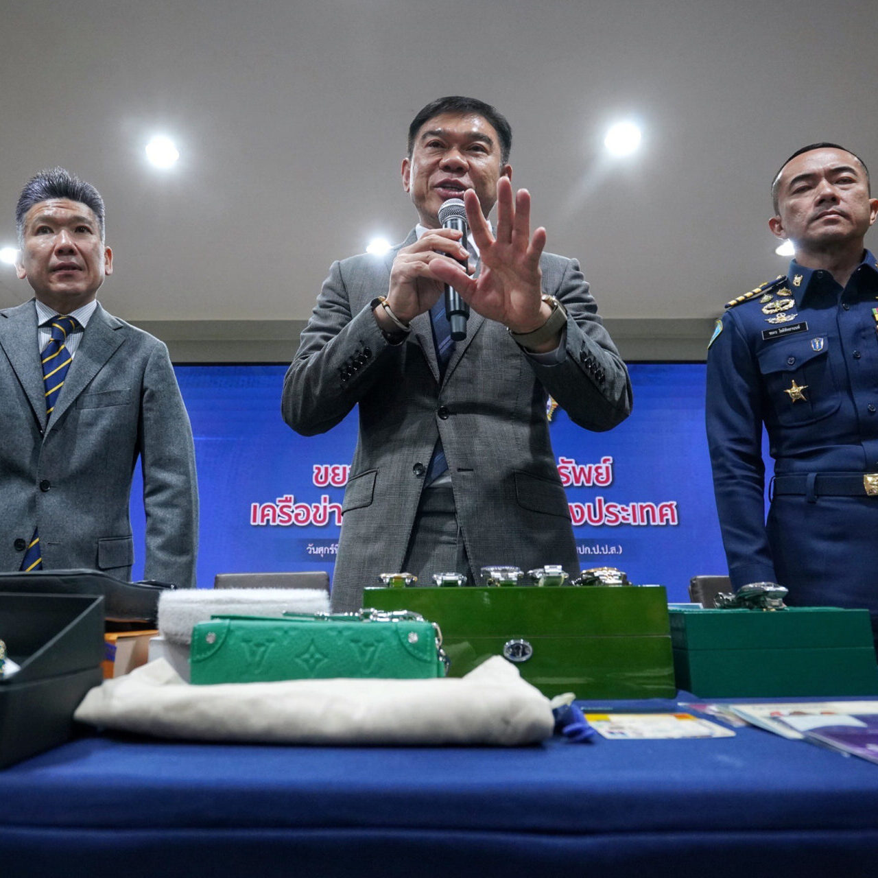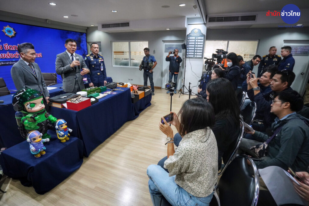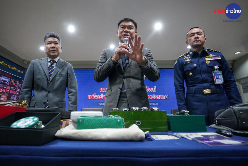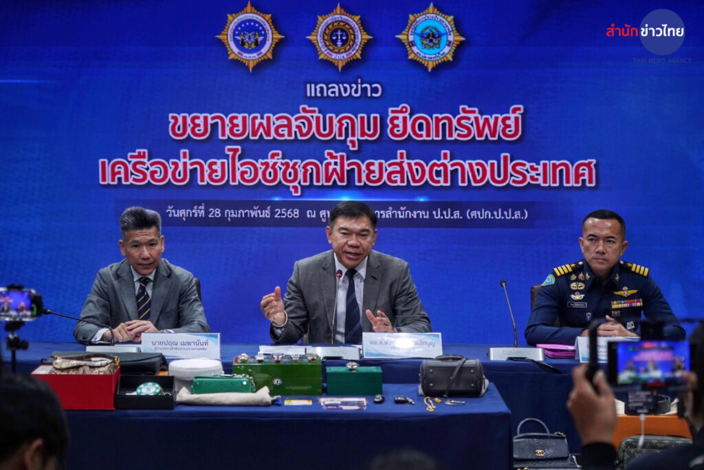 พล.ต.ท.ภาณุรัตน์ หลักบุญ เลขาธิการ ป.ป.ส. พร้อมด้วย นายปฤณ เมฆานันท์ ผู้อำนวยการสำนักปราบปรามยาเสพติด น.อ.ชยกร โชติพิทยานนท์ ผู้บังคับการกรมทหารสารวัตรทหารอากาศ และ น.อ.เอกวิทย์ โชติเชย รองผู้บังคับการกรมทหาร สารวัตรทหารอากาศ แถลงผลจับกุมผู้ต้องหาตามหมายจับศาลอาญา ซึ่งมีบทบาทสำคัญเป็นผู้สั่งการของเครือข่ายไอซ์ข้ามชาติ และมีพฤติการณ์สั่งการให้บุคคลในเครือข่ายลักลอบจัดส่งไอซ์ไปประเทศที่สาม