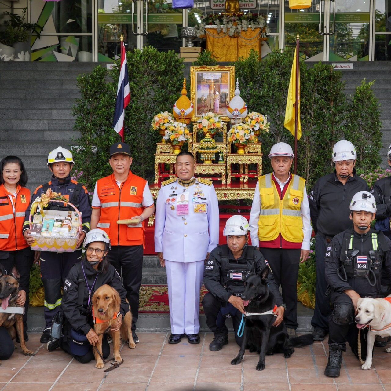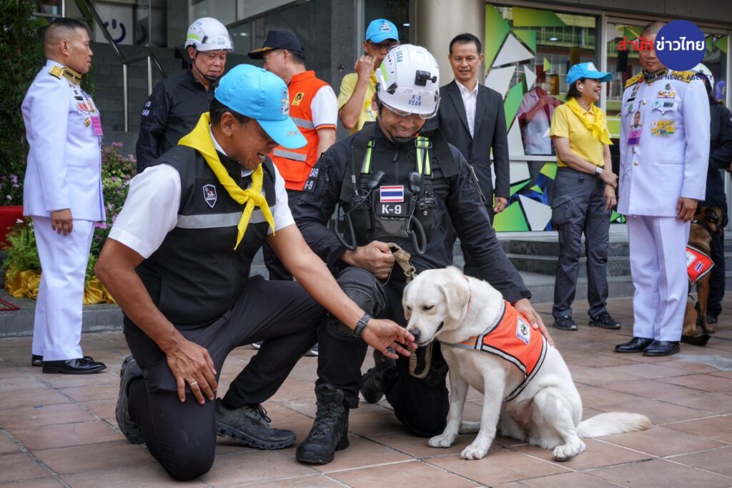 10 เม.ย.2568 พระบาทสมเด็จพระเจ้าอยู่หัว และสมเด็จพระนางเจ้าฯ พระบรมราชินี ทรงพระกรุณาโปรดเกล้าฯ ให้ พลเรือตรี สกาย เภกะนันทน์ เป็นผู้เชิญของพระราชทาน ประกอบด้วย เงินจำนวน 3 แสนบาท พร้อม ตะกร้าสิ่งของผลิตภัณฑ์อาหารและบำรุงสำหรับสุนัข เพื่อเป็นขวัญกำลังใจ แก่ ทีมสุนัขค้นหา และกู้ภัย (K9 ) 3 หน่วยงาน ได้แก่ ทีมสุนัขค้นหากองบังคับการสุนัขตำรวจ ทีมสุนัขค้นหา กรมการสัตว์ทหารบก และ ทีมสุนัขค้นหาองค์การสุนัขกู้ภัยแห่งชาติ (ทีม USAR Thailand ) โดยมี นาย ชัชชาติ สิทธิพันธุ์ ผู้ว่าราชการกรุงเทพมหานคร นายภาสกร บุญญลักษณ์ อธิบดีกรมป้องกันและบรรเทาสาธารณภัย พล.ต.สมพงษ์ สุขประดิษฐ เจ้ากรมการสัตว์ทหารบก และ พล.ต.ท.สยาม บุญสม ผบช.น. เป็นผู้รับมอบ ที่กองอำนวยการร่วม กองทัพภาคที่1 ศูนย์บัญชาการเหตุการณ์สำนักงานเขตจตุจักร