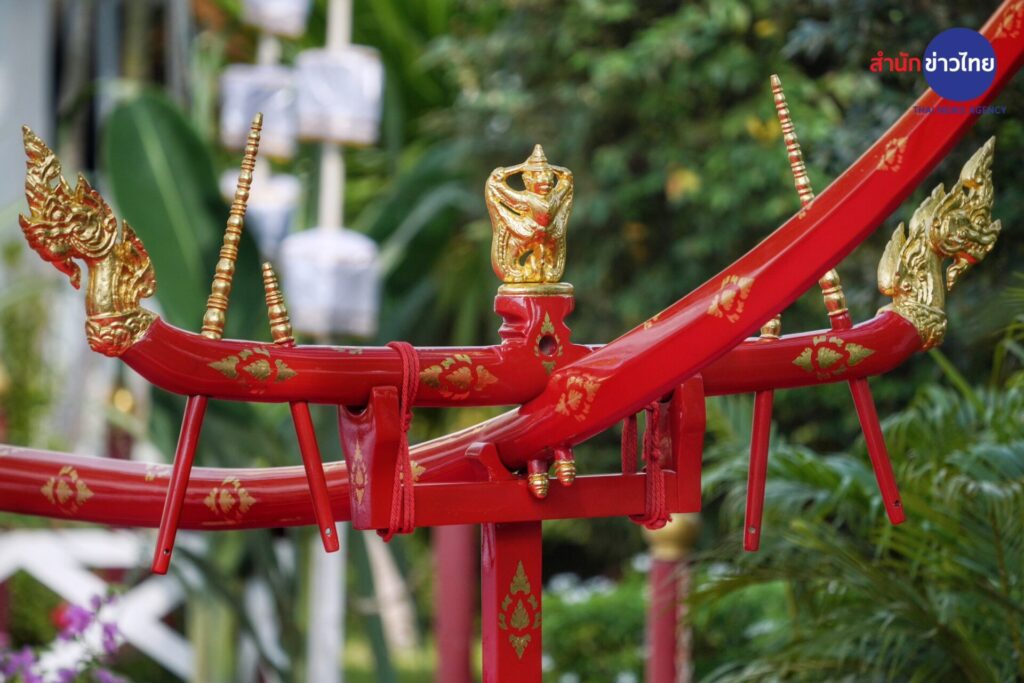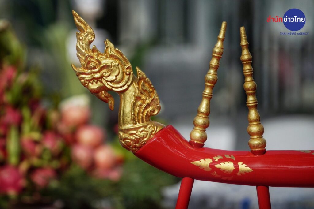 ซึ่งมีชุดองค์ประกอบ คือ คันไถ สีแดงชาดลงรักปิดทองตลอดคัน ขนาดความสูง 2.26 เมตร ยาว 6.59 เมตร หัวคันไถทาเป็นเศียรพญานาค ลวดลายประดับคันไถเป็นลายกระจังตาอ้อย ปลายไถหุ้มผ้าขาวขลิบทองสำหรับมือจับ แอกเทียมพระโค ยาว 1.55 เมตร ตรงกลางแอกประดับด้วยรูปครุฑยุดนาคหล่อด้วยทองเหลืองลงรักปิดทองอยู่บนฐานบัว ปลายแอกทั้งสองด้าน แกะสลักเป็นรูปเศียรพญานาคลงรักปิดทอง ปลายแอกแต่ละด้านมีลูกแอกทั้งสองด้านสำหรับเทียมพระโคพร้อมเชือกกระทาม ฐานรองเป็นที่สำหรับรองรับคันไถพร้อมแอก ทำด้วยไม้เนื้อแข็ง และธงสามชาย เป็นธงประดับคันไถ ติดตั้งอยู่บนเศียรนาคทำด้วยกระดาษ และผ้าสักหลาด เขียนลวดลายลงรักปิดทอง ประดับด้วยกระจกแวว มีพู่สีขาวประดับเป็นเครื่องสูงชนิดหนึ่ง เพื่อประดับพระเกียรติ
