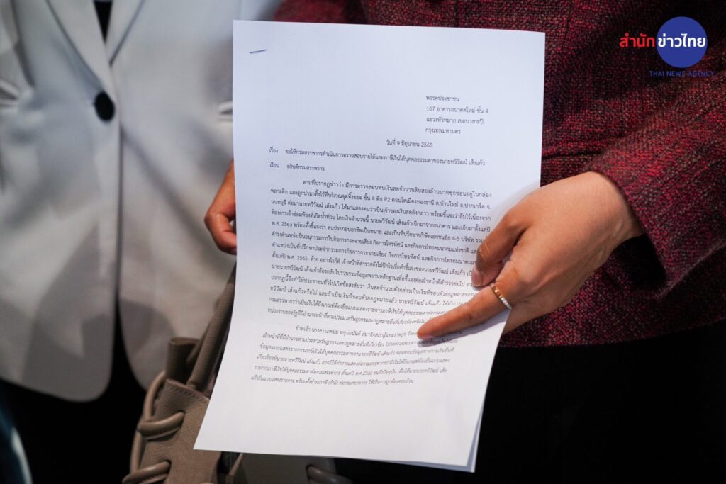 9 มิ.ย.68 นางสาวรักชนก ศรีนอก สส.กรุงเทพฯ พรรคประชาชน นางสาวพนิดา มงคลสวัสดิ์ สส.สมุทรปราการ พรรคประชาชน และ นางสาวภคมน หนุนอนันต์ สส.บัญชีรายชื่อ พรรคประชาชน เข้ายื่นหนังสือต่อกรมสรรพากร เรียกร้องให้พิจารณาตรวจสอบที่มาของรายได้และเส้นทางการเงิน จำนวน 12 ล้านบาท ของนายทวีวัฒน์ เส้งแก้ว
