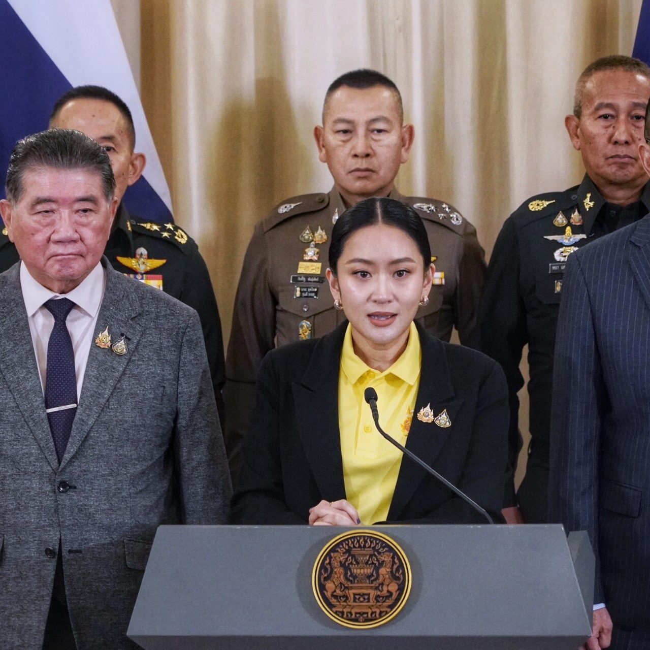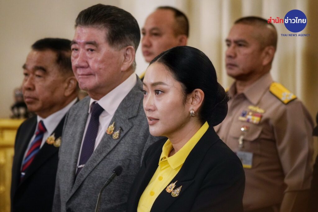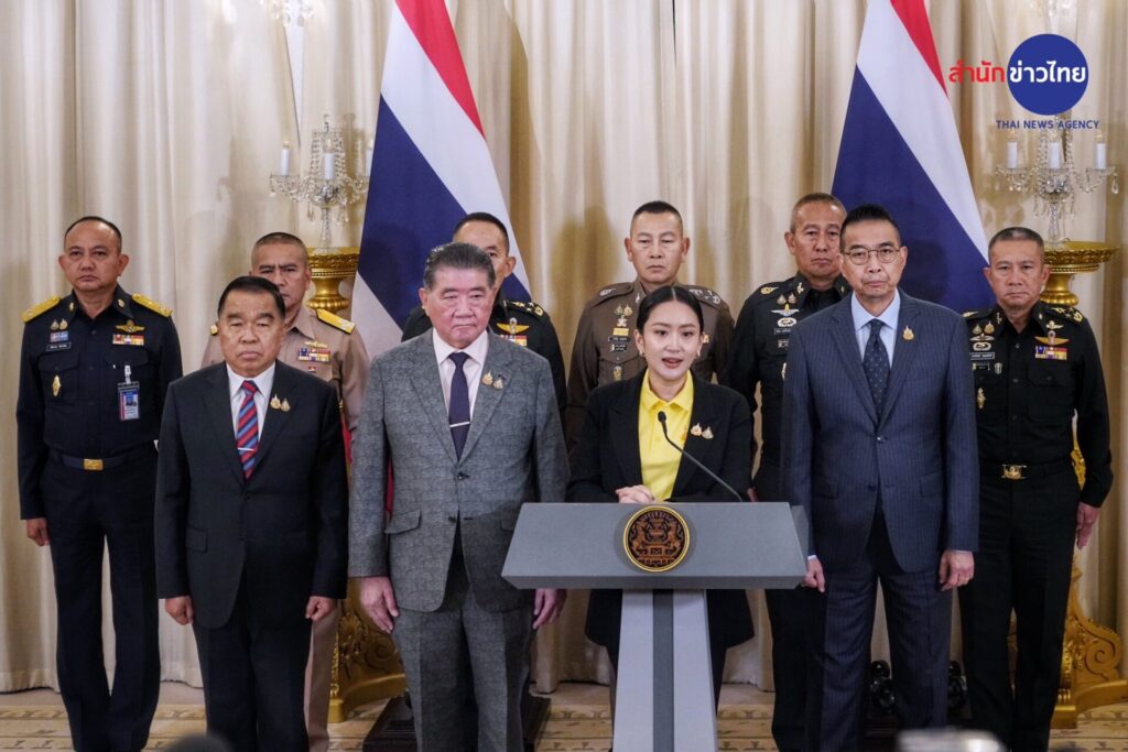 นางสาวแพทองธาร ชินวัตร นายกรัฐมนตรี แถลงภายหลังเรียกประชุมหน่วยงานที่เกี่ยวข้อง เพื่อรายงานผลการประชุมของศูนย์เฉพาะกิจบริหารสถานการณ์บริเวณชายแดนไทย-กัมพูชา (ศบ.ทก.) รวมถึงสถานการณ์ชายแดนไทย-กัมพูชา ภายหลังเกิดกรณีคลิปเสียงการโทรศัพท์เจรจาระหว่าง น.ส.แพทองธาร กับ สมเด็จฮุน เซน ประธานวุฒิสภากัมพูชา ว่าได้เชิญหน่วยงานด้านความมั่นคงมาพูดคุยถึงสถานการณ์ชายแดนไทย-กัมพูชา และก่อนอื่นต้องขออภัยพี่น้องประชาชน และคนไทยทุกคน กรณีที่มีคลิปเสียงหลุดออกมาระหว่างที่ตนคุยกับผู้นำกัมพูชา ความจริงเป็นเรื่องที่ไม่น่าจะเกิดขึ้น ก็ต้องขออภัยพี่น้องประชาชนที่ทำให้เกิดความไม่สบายใจ ตนมีโอกาสได้คุยกับเจ้าหน้าที่และกองทัพ อธิบายถึงเหตุผลว่า เป็นเพียงแท็กติกของการสื่อสารที่จะเจรจาต่อไปว่า เราจะต้องแสดงความเข้าใจก่อน เพื่อที่จะคุยต่อไป เป็นการต่อรองเพื่อให้การปะทะนั้นหยุดลง ด้วยความตั้งใจที่แท้จริงว่าต้องการจะให้สถานการณ์สงบสุขเท่านั้นเอง และก็ไม่ทราบจริงๆ ว่าจะมีการอัดคลิปและเผยแพร่เช่นนี้ ก็ได้ทำความเข้าใจกับทางกองทัพเรียบร้อยแล้ว และรับฟังว่าวันนี้เราต้องร่วมมือกันที่จะผนึกกำลังเอาไว้ คนไทยทุกคนก็ต้องผนึกกำลังเอาไว้ วันนี้เราไม่มีเวลาที่จะมาทะเลาะกันเอง เราต้องปกป้องอธิปไตย และยินดีสนับสนุนกองทัพทุกรูปแบบ และวันนี้การที่เราจะทำอะไรหรือตัดสินใจในเรื่องต่าง ๆ เราต้องคำนึงถึงประชาชนคนไทยที่อยู่ในกัมพูชาด้วย รวมทั้งประชาชนตรงชายแดน ที่เราต้องนึกถึง และต้องให้ความมั่นใจให้ความปลอดภัยกับพี่น้องประชาชนด้วย