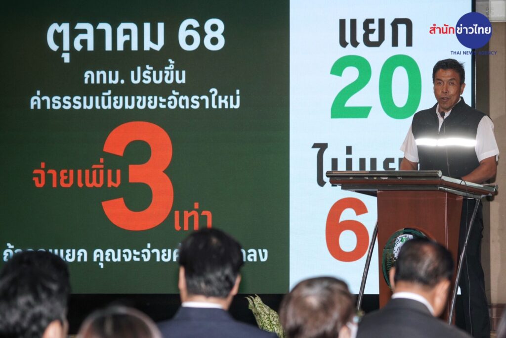 14 ก.ค.2568 นายชัชชาติ สิทธิพันธุ์ ผู้ว่าราชกา กรุงเทพมหานคร พร้อม เครือข่ายสังคมลดขยะ Less Plastic Thailand ร่วมแถลงข่าว “โครงการบ้านนี้ไม่เทรวม : แยกขยะลดค่าธรรมเนียม” นับถอยหลัง 80 วัน จัดเก็บค่าธรรมเนียมขยะใหม่ ซึ่งจะเริ่มเดือนตุลาคม 2568 นี้