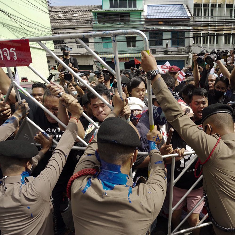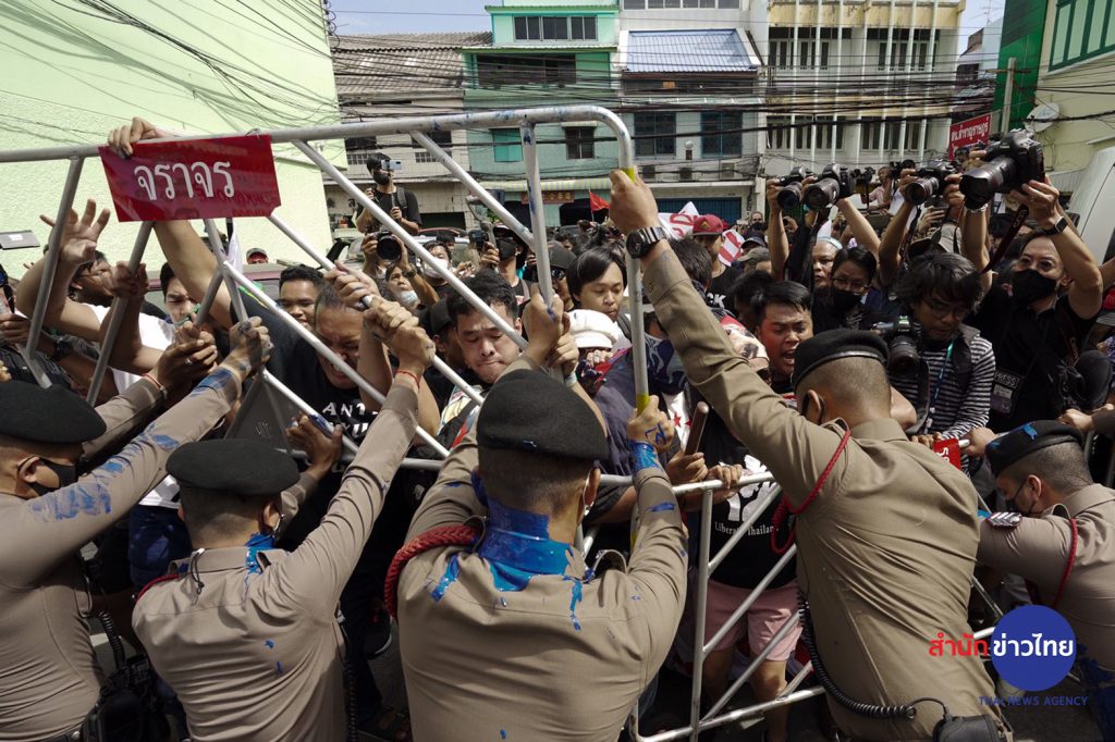 ทั้งนี้ มีรายงานว่าขณะที่กลุ่มผู้ชุมนุมเดินทางมามอบตัว สน.สำราญราษฎร์ ได้มีการตั้งรั้วเหล็กกั้นพื้นที่ และขอตรวจสอบรายชื่อ ทำให้กลุ่มผู้ชุมนุมไม่พอใจและเกิดความวุ่นวายขึ้น เพราะผู้ชุมนุมพยายามฝ่าแนวกั้นเข้าไปใน สน. ก่อนยืนรอแกนนำมากันจนครบจึงขึ้นไปรับทราบข้อกล่าวหา นอกจากนี้ยังติดตั้งเครื่องขยายเสียงหน้า สน. รอบุคคลที่เข้าไปมอบตัวทั้ง 15 คน ออกมาด้วย