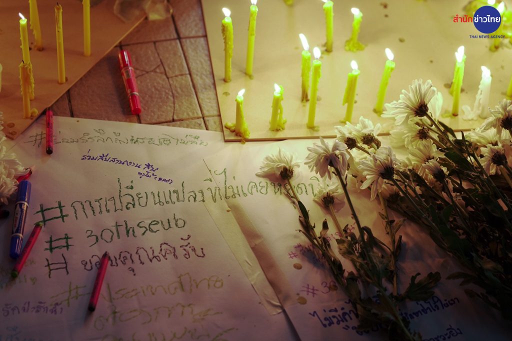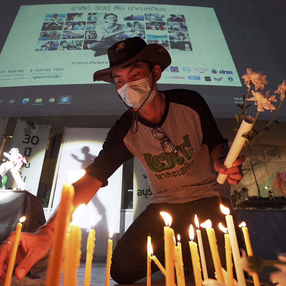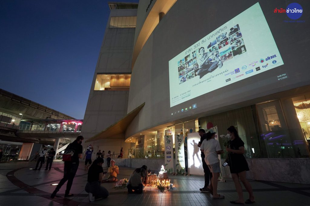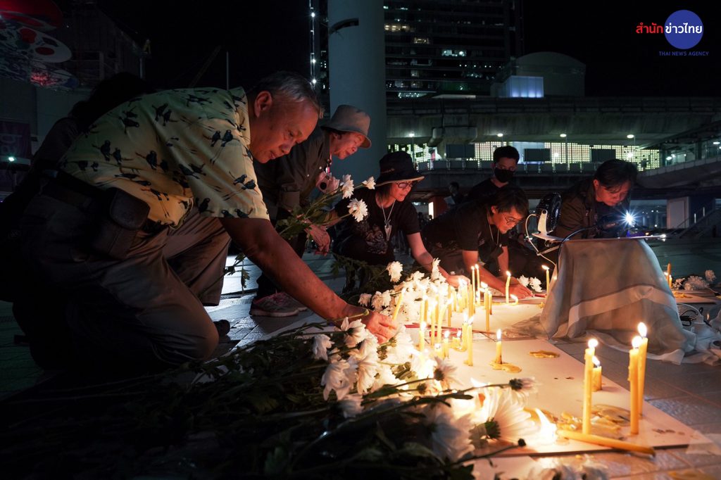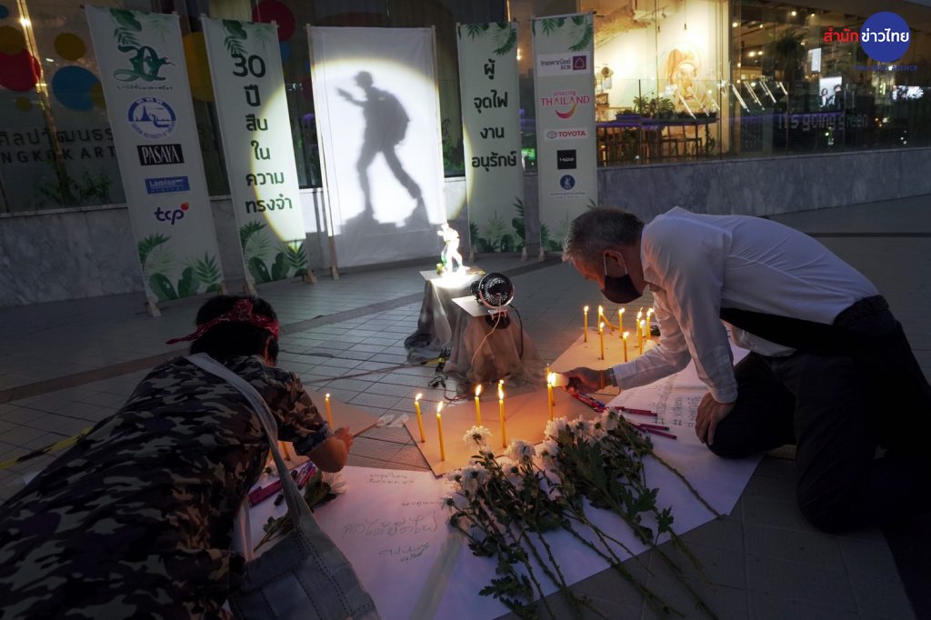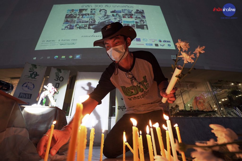 กรุงเทพฯ 1 ก.ย. – บรรยากาศลานหน้าหอศิลปวัฒนธรรมแห่งกรุงเทพมหานคร”มูลนิธิสืบนาคะเสถียร”ได้จัดให้ประชาชนร่วมวางดอกไม้และจุดเทียนรำลึกถึงคุณงามความดีของ สืบ นาคะเสถียร อดีตหัวหน้าเขตรักษาพันธุ์สัตว์ป่าห้วยขาแข้ง ซึ่งภายในกิจกรรมมีการฉายข้อความรณรงค์สิ่งแวดล้อมและหนังสารคดีสั้น ซึ่งเป็นส่วนหนึ่งของกิจกรรมรำลึก 30 ปี สืบ นาคะเสถียร นักอนุรักษ์ต้นแบบในความทรงจำ .- สำนักข่าวไทย