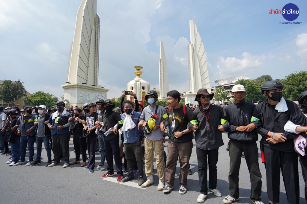 เวลา 13.30 น. กลุ่มมวลชนคณะราษฎรได้สร้างแนวกั้นตำรวจโดยรอบอนุสาวรีย์ประชาธิปไตยเพื่อขึ้นไปบนฐานโดยรอบ ทำให้กลุ่มมวลชนที่สวมเสื้อสีเหลือง ไม่พอใจถึงการกระทำดังกล่าวได้วิ่งเข้ามาและขว้างร่ม ขวดน้ำมายังกลุ่มผู้ชุมนุมคณะราษฎร จนเกือบจะเกิดการปะทะ ทำให้เจ้าหน้าที่ต้องรีบเข้าควบคุมสถานการณ์ได้แยกกลุ่มผู้ชุมนุมออกจากกัน