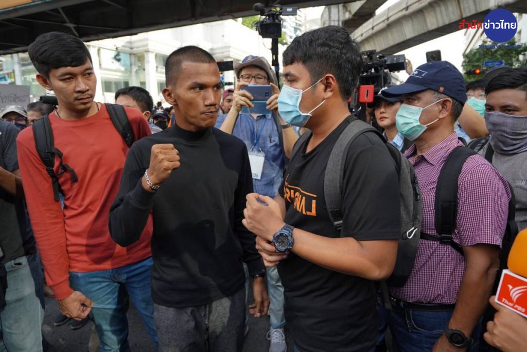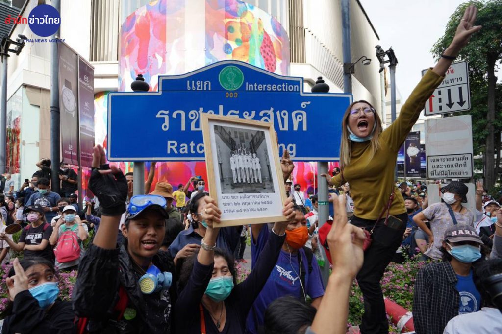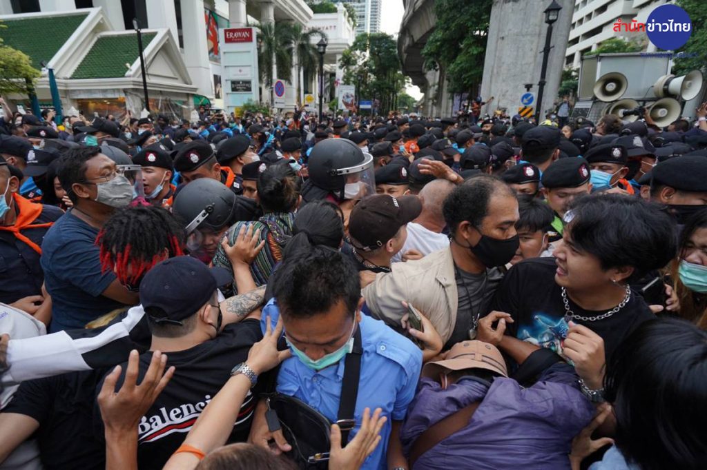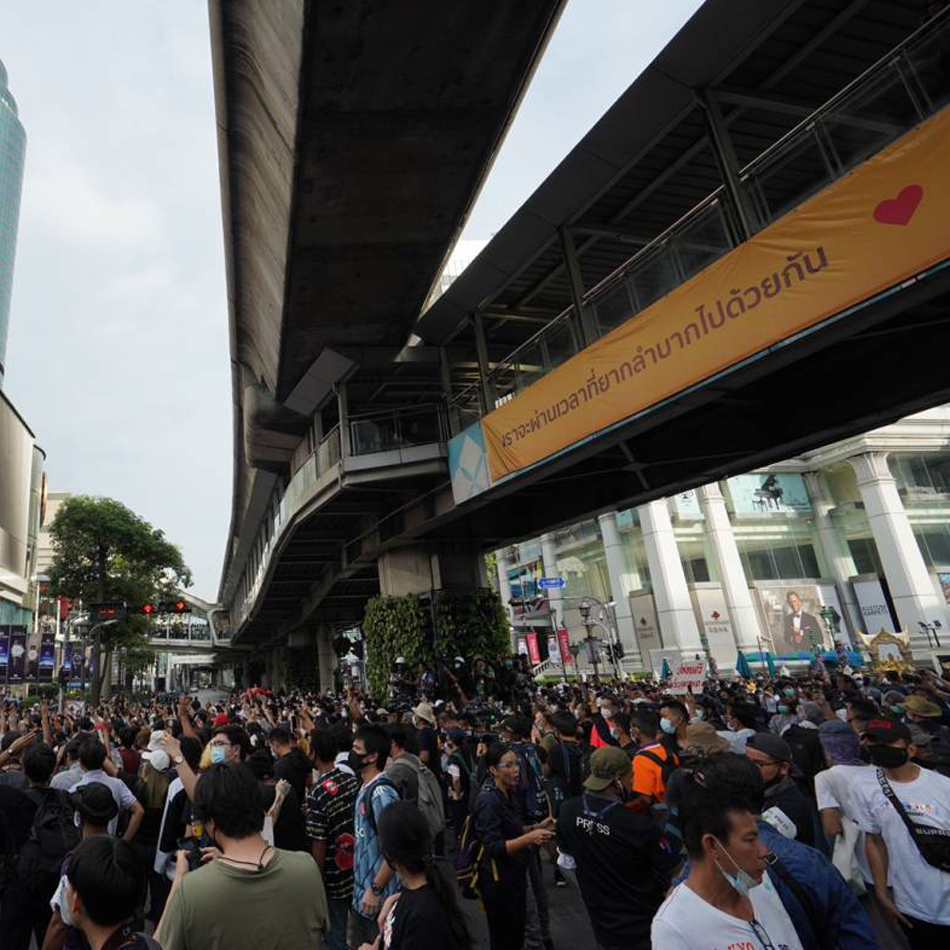 เวลา 16.00 น. บรรยากาศบริเวณแยกราชประสงค์ มีกลุ่มผู้ชุมนุมจำนวนมาก นำโดย ไมค์ ระยอง มารวมตัว และผลักดันแนวกั้นของเจ้าหน้าที่ เพื่อปิดการจราจร บริเวณแยกราชประสงค์ และนั่งลงกลางแยกราชประสงค์ ขณะที่เจ้าหน้าที่ยอมถอยไปยืนสังเกตการณ์ และดูแลความสงบอยู่ริมฟุตบาท ทำให้สภาพการจราจรบริเวณดังกล่าวถูกปิดไปโดยปริยาย ซึ่งการชุมนุมดังกล่าวผู้ชุมนุม ส่วนใหญ่เป็นกลุ่มวัยรุ่นและนักเรียนนักศึกษา ได้เรียกร้องให้เจ้าหน้าที่ ปล่อยตัวแกนนำกลุ่มผู้ชุมนุม ที่ถูกจับกุมไปก่อนหน้านี้ และปราศรัยต่อว่าเจ้าหน้าที่ว่าทำงานอยู่ภายใต้เผด็จการ และขณะนี้ กลุ่มผู้ชุมนุมได้นั่งลงกลางแยกราชประสงค์แล้ว