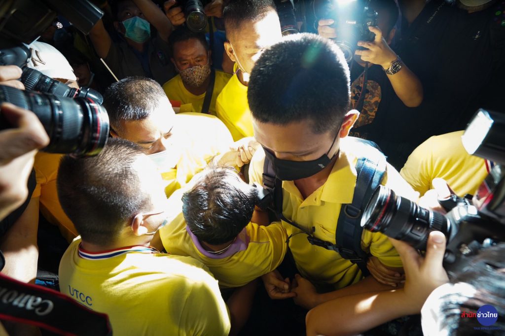 อย่างไรก็ตาม ก่อนทำกิจกรรมร้องเพลงชาติเกิดเหตุวุ่นวายขึ้นเมื่อมีชายวัยกลางคน สวมใส่เสื้อเหลืองเข้ามาปะปนในพื้นที่ของกลุ่มปกป้องสถาบัน และชูสามนิ้ว โดยชายคนนี้เคยปรากฏตัวในการชุมนุมของกลุ่มปกป้องสถาบันมาแล้วก่อนหน้านี้ ทำให้กลุ่มคนปกป้องสถาบันไม่พอใจ เข้ามาล้อมต่อว่า ขับไล่และขอให้ออกจากพื้นที่แต่ชายคนดังกล่าวไม่ยอมออกจากบริเวณดังกล่าว และนั่งลงกับพื้น ขณะที่กลุ่มปกป้องสถาบันพยายามห้ามปรามกันเองไม่ให้เข้าไปทำร้ายคนดังกล่าว