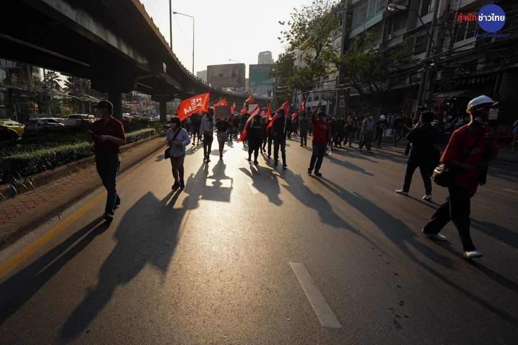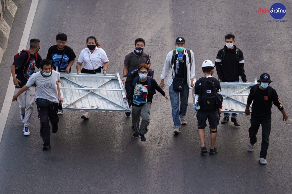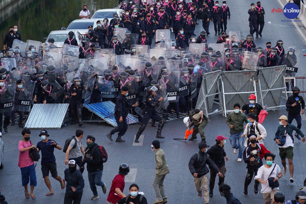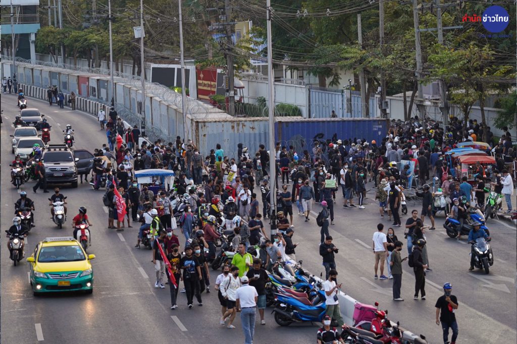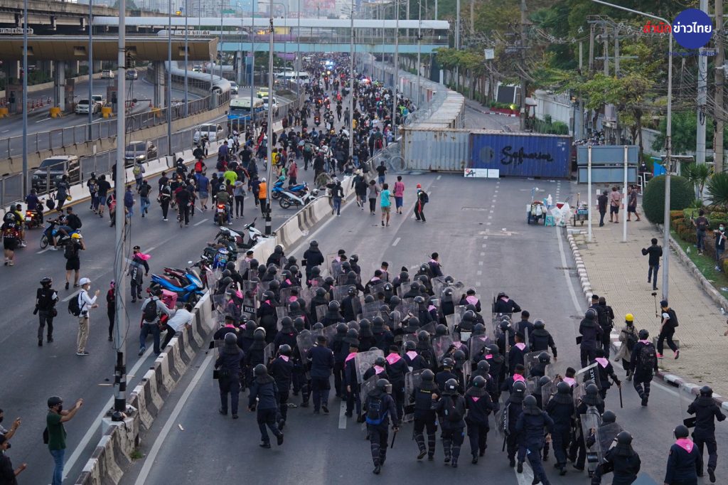 เมื่อเวลา 18.00 น. วันนี้ (28 ก.พ.) กลุ่มผู้ชุมนุมได้เข้ามาถึงบริเวณด้านหน้ากรมทหารราบที่ 1 โดยหัวขบวนลงด่านเก็บเงินค่าผ่านทางโทลล์เวย์ดินแดง ช่วยกันเคลื่อนย้ายตู้คอนเทนเนอร์ออกจากที่เจ้าหน้าที่นำมาวางไว้เป็นแนวกั้นระหว่างผู้ชุมนุมกับตำรวจชุดควบคุมฝูงชน พร้อมรั้วลวดหนามที่เจ้าหน้าที่วางไว้ด้านบนของตู้คอนเทนเนอร์ ขณะที่มวลชนกลุ่มหนึ่งพยายามฝ่าด่านตำรวจชุดควบคุมฝูงชนเข้าไปภายในแนวรั้วชั้นใน ซึ่งติดกับรั้วของกรมทหารราบที่ 1