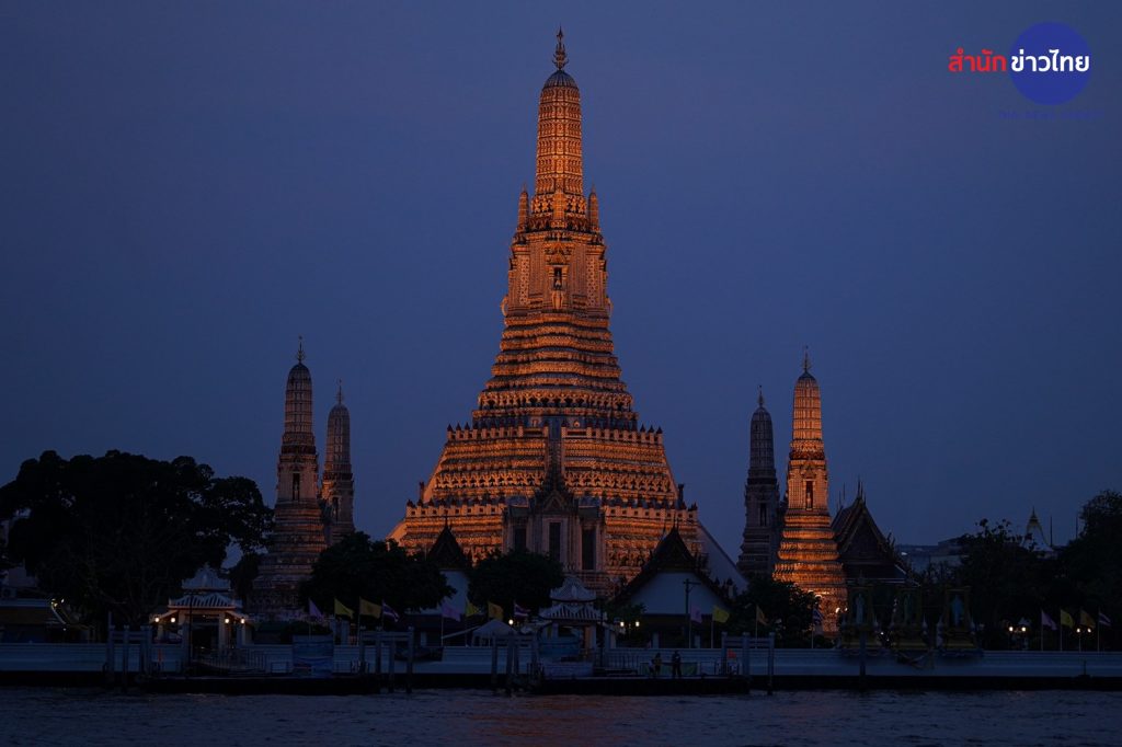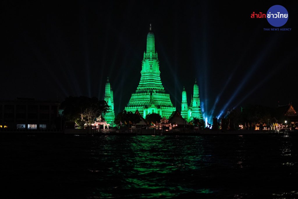 ประดับไฟสีเขียว ณ พระปรางค์วัดอรุณราชวราราม หนึ่งในสถานที่สวยสุดในกรุงเทพฯ