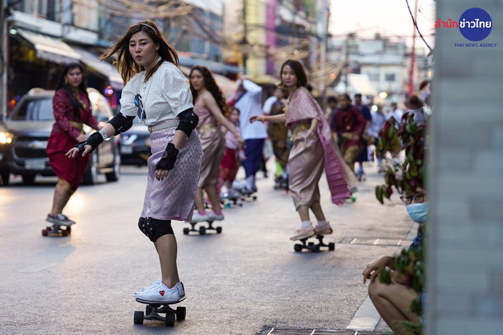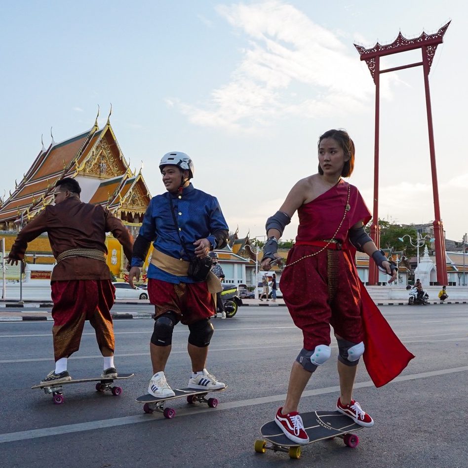 ผ้าสไบสวยงาม ปลิวสะบัดสวัดไสวไปตามแรงลมและลีลาของเหล่านักเซิร์ฟสเก็ตสาว ที่กำลังท่องเที่ยวลัดเลาะไปทั่วกรุงรัตนโกสินทร์พร้อมกับอุปกรณ์คู่ใจ เรียกให้ทุกสายตาต้องจับจ้องกับความงดงามที่แฝงไปด้วยความเท่ของออเจ้าทั้งหลาย