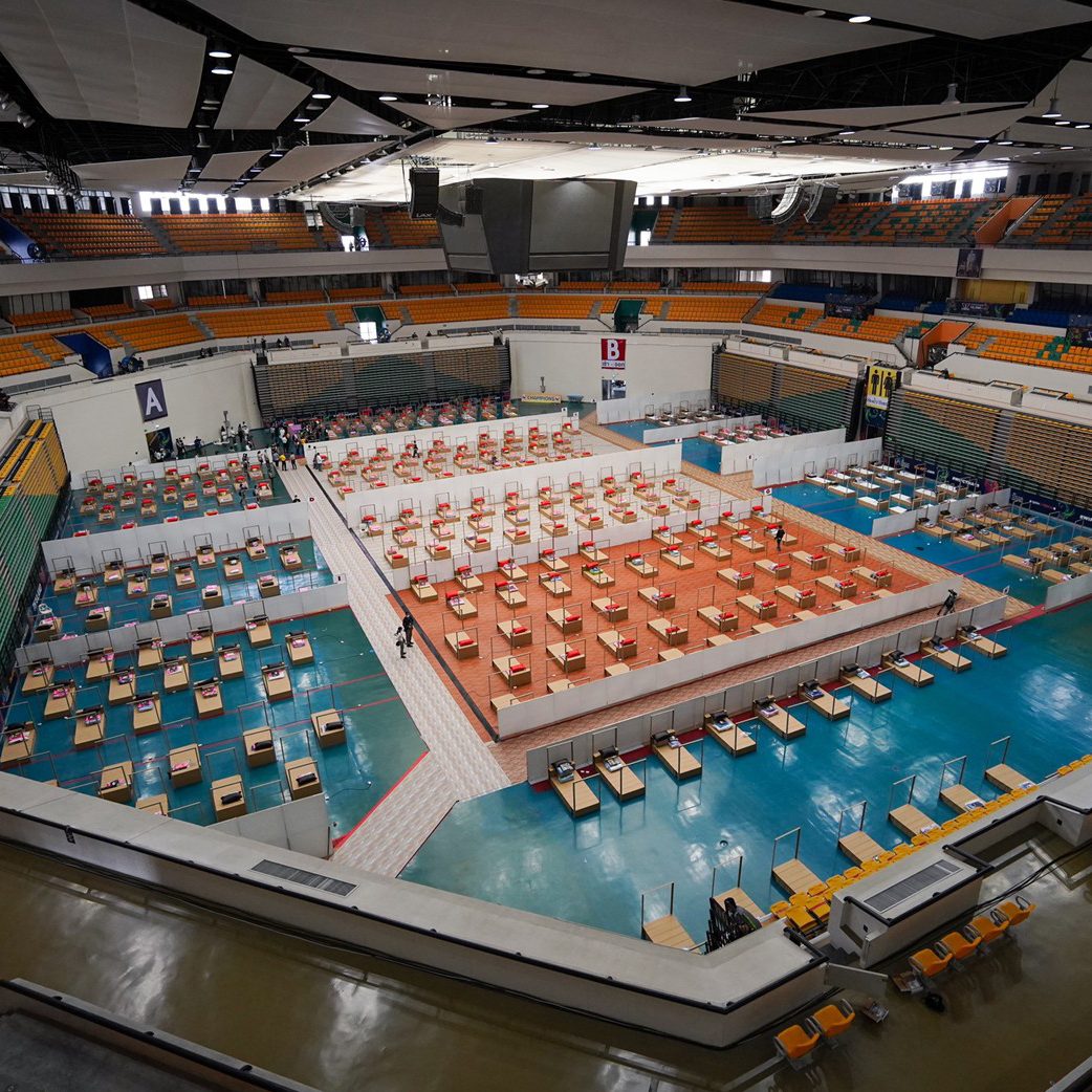 พล.ต.อ.อัศวิน ขวัญเมือง ผู้ว่าราชการกรุงเทพมหานคร (กทม.) ตรวจความพร้อมโรงพยาบาลสนามเอราวัณ 2 ก่อนเปิดรองรับผู้ป่วยที่เข้ามาพักรักษาจากการติดเชื้อโควิด-19 ในวันพรุ่งนี้ (19 เม.ย.) หลังจากดัดแปลงอาคารบางกอก อารีน่า เขตหนองจอก เป็นโรงพยาบาลสนาม โดยเจ้าหน้าที่ติดตั้งเตียงกระดาษรีไซเคิลที่ได้รับการสนับสนุนจากภาคเอกชน 400 เตียง สำหรับผู้ป่วยชาย 150 เตียง หญิง 250 เตียง และจัดเตรียมอุปกรณ์เครื่องนอน หมอน มุ้ง ผ้าห่ม เครื่องมือทางการแพทย์ รวมถึงพัดลมระบายอากาศขนาดใหญ่ เดินสายไฟและติดตั้งปลั๊กไฟภายในอาคารอย่างทั่วถึง ติดตั้งระบบกล้อง CCTV ปรับปรุงระบบสุขาภิบาล การกำจัดขยะ-น้ำเสีย และระบบซักล้างปลอดเชื้อ