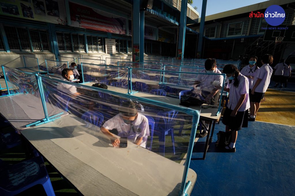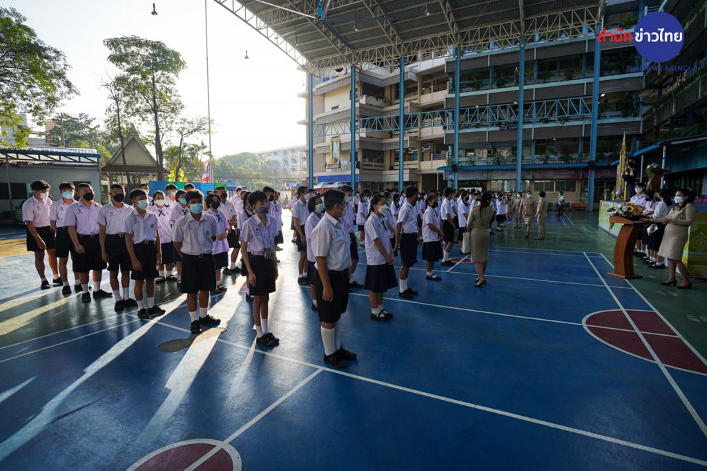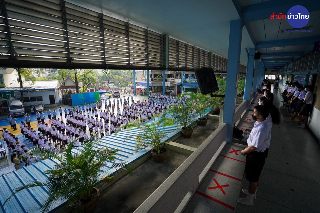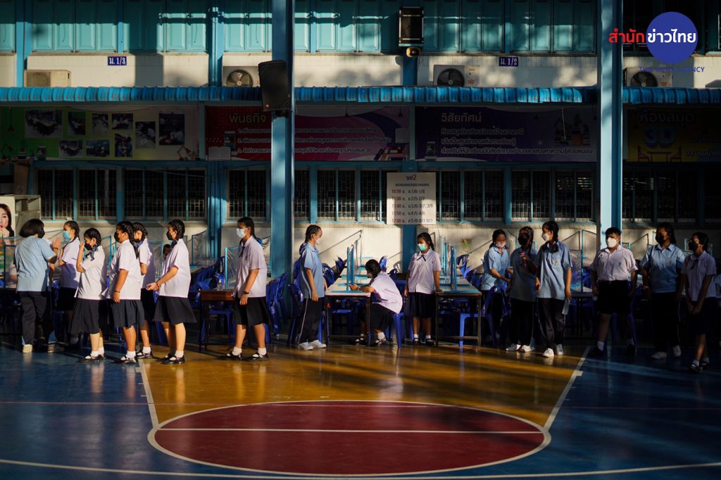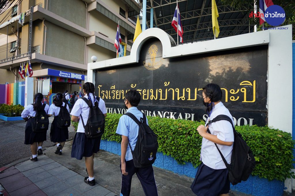 15 พ.ย. 2564 บรรยากาศการเปิดเรียนวันแรกแบบ On-Site ที่โรงเรียนมัธยมบ้านบางกะปิ โดยนักเรียนระดับชั้น ม.1-6 ต่างสวมเครื่องแบบนักเรียนมาเรียนอย่างเป็นระเบียบ โดยทางโรงเรียนได้มีมาตรการป้องกันโควิด-19 อย่างเข้มงวด โดยตั้งแต่บริเวณทางเข้าโรงเรียนได้มีจุดคัดกรองเบื้องต้น ด้วยการติดตั้งเครื่องวัดอุณหภูมิและเจลล้างมือ ก่อนเข้าโรงเรียน โดยจะแบ่งการเข้าแถวของนักเรียน เป็นด้านล่างอาคาร และบางส่วนให้ยืนเข้าแถวทำกิจกรรมอยู่บนอาคาร เพื่อเป็นการเว้นระยะห่างลดความแออัด โดยโรงเรียนมัธยมบ้านบางกะปิ มีนักเรียนระดับชั้น ม.1-6 รวมกว่า 2,000 คน ในการเปิดเรียนได้แบ่งนักเรียนมาเรียนทีละครึ่งหรือจัดเป็นกลุ่ม เอและบี ห้องเรียนละไม่เกิน 20 คน ยกเว้นนักเรียน English Program ซึ่ง 1 ห้องมีนักเรียนไม่เกิน 30 คน