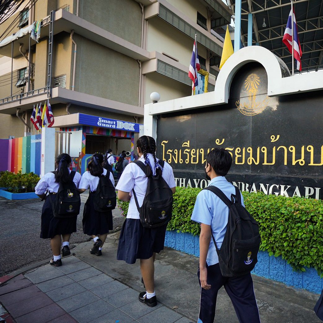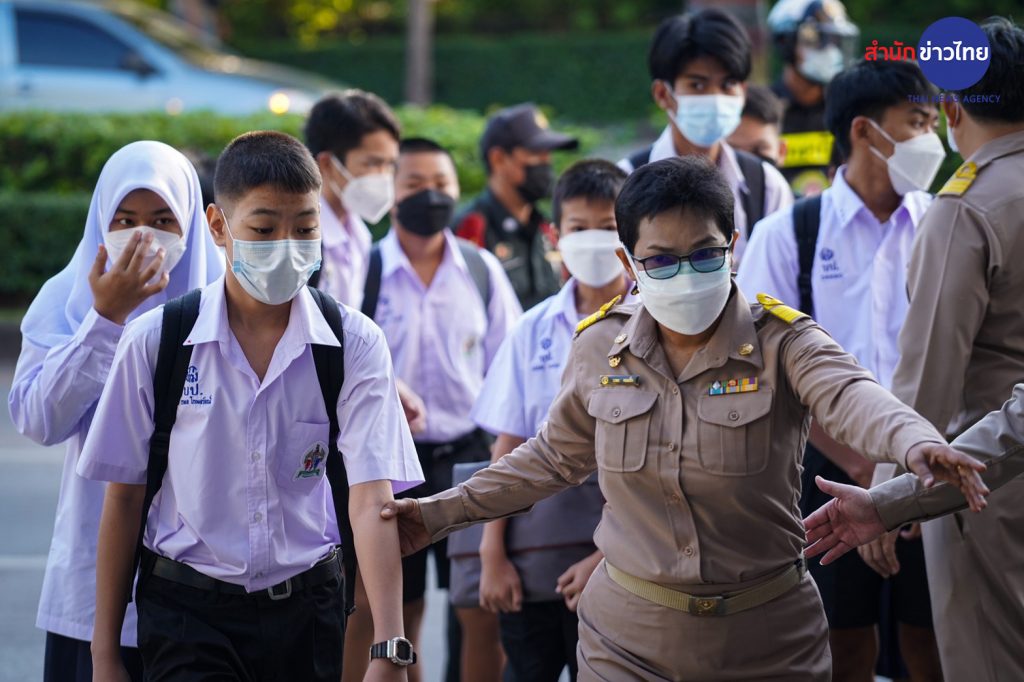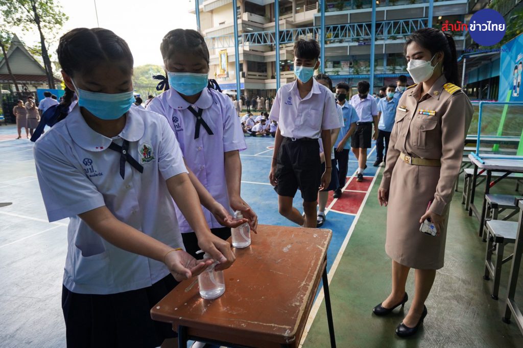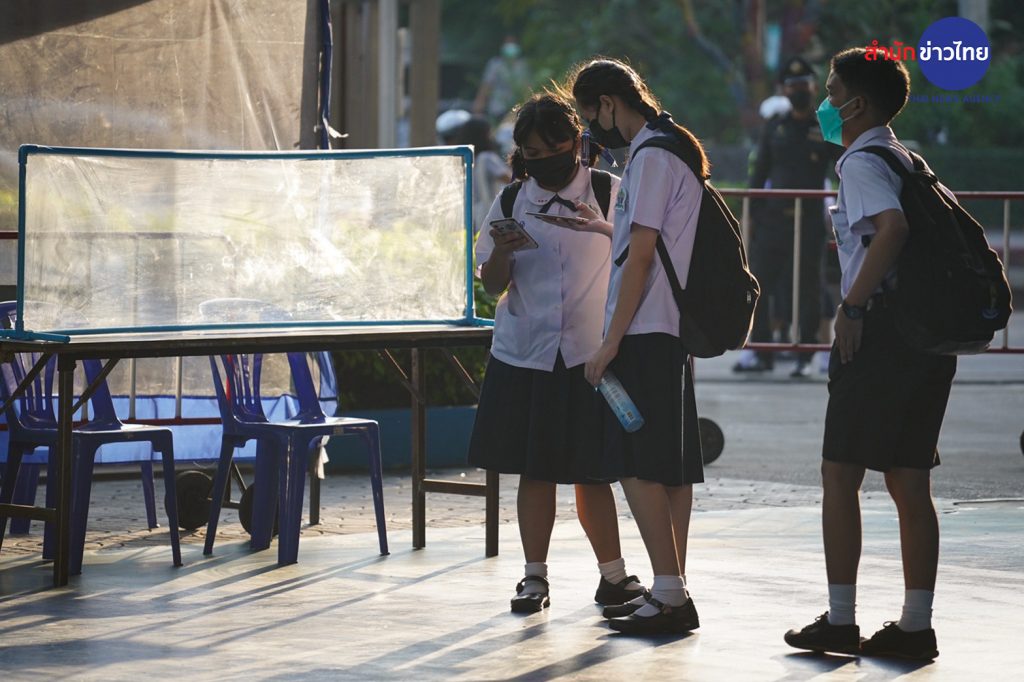 15 พ.ย. 2564 บรรยากาศการเปิดเรียนวันแรกแบบ On-Site ที่โรงเรียนมัธยมบ้านบางกะปิ โดยนักเรียนระดับชั้น ม.1-6 ต่างสวมเครื่องแบบนักเรียนมาเรียนอย่างเป็นระเบียบ โดยทางโรงเรียนได้มีมาตรการป้องกันโควิด-19 อย่างเข้มงวด โดยตั้งแต่บริเวณทางเข้าโรงเรียนได้มีจุดคัดกรองเบื้องต้น ด้วยการติดตั้งเครื่องวัดอุณหภูมิและเจลล้างมือ ก่อนเข้าโรงเรียน โดยจะแบ่งการเข้าแถวของนักเรียน เป็นด้านล่างอาคาร และบางส่วนให้ยืนเข้าแถวทำกิจกรรมอยู่บนอาคาร เพื่อเป็นการเว้นระยะห่างลดความแออัด โดยโรงเรียนมัธยมบ้านบางกะปิ มีนักเรียนระดับชั้น ม.1-6 รวมกว่า 2,000 คน ในการเปิดเรียนได้แบ่งนักเรียนมาเรียนทีละครึ่งหรือจัดเป็นกลุ่ม เอและบี ห้องเรียนละไม่เกิน 20 คน ยกเว้นนักเรียน English Program ซึ่ง 1 ห้องมีนักเรียนไม่เกิน 30 คน