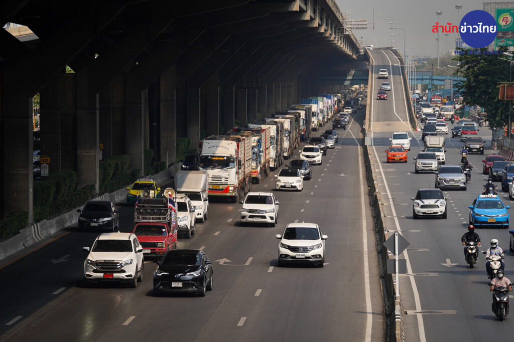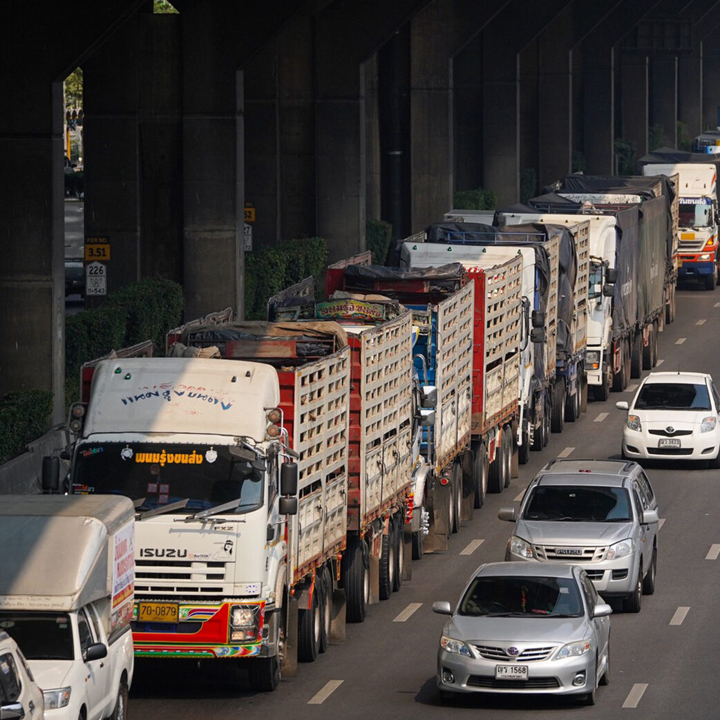 บรรยากาศที่กระทรวงพลังงาน ถนนวิภาวดีรังสิต กลุ่มสหพันธ์การขนส่งทางบกแห่งประเทศไทย นำรถบรรทุกจำนวนมาก พร้อมรถเวทีปราศรัยเคลื่อนที่ รวมตัวกันจัดกิจกรรมรับ “Truck power final season” เรียกร้องให้ลดราคาน้ำมันดีเซลเหลือลิตรละ 25 บาท