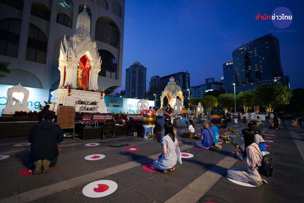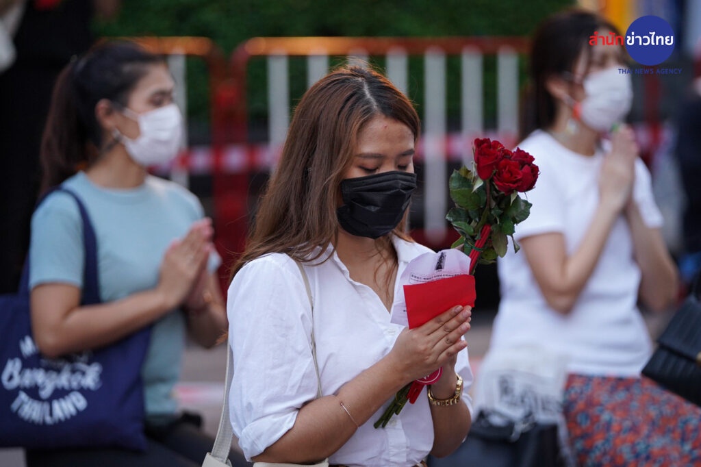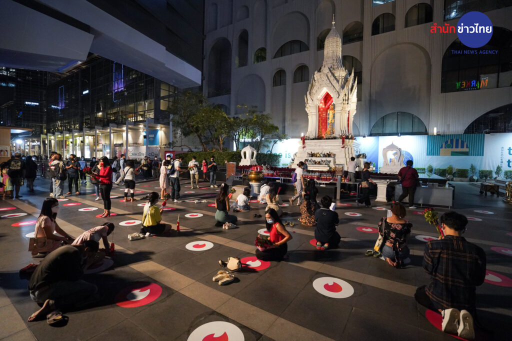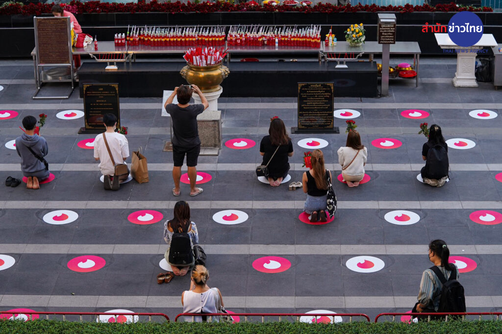 บรรยากาศประชาชนที่มาไหว้ขอพรกับพระตรีมูรติ บริเวณลานด้านหน้าศูนย์การค้าเซ็นทรัลเวิลด์ เป็นไปอย่างคึกคัก พร้อมทั้งจัดระเบียบการไหว้แบบเว้นระยะห่าง ภายใต้แคมเปญ “LOVE destiNATION : Eat Play Love” รับเทศกาลวาเลนไทน์ที่กำลังจะมาถึง ซึ่งได้รับความสนใจเป็นอย่างมาก จากบรรดาคนโสดที่เดินทางมาขอพร เพื่อให้สมหวังในความรัก