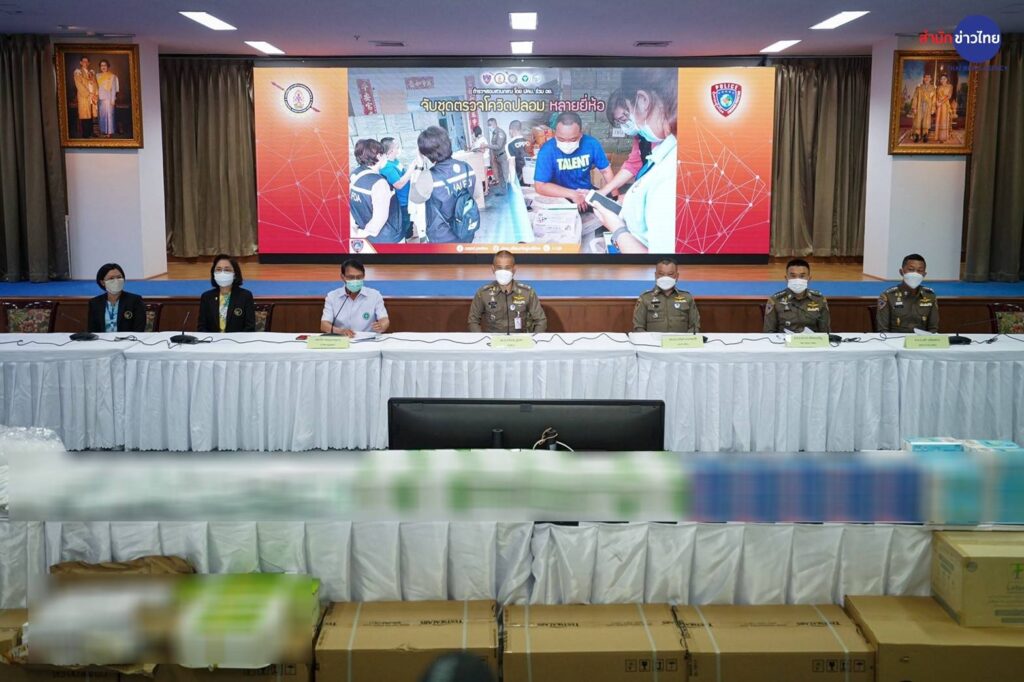 พลตำรวจโทจิรภพ ภูริเดช ผู้บัญชาการตำรวจสอบสวนกลาง ร่วมกับตำรวจกองบังคับการปราบปรามการกระทำความผิดเกี่ยวกับการคุ้มครองผู้บริโภค หรือ บก.ปคบ. แถลงผลตรวจค้น แหล่งผลิตชุดตรวจโควิด-19 ปลอม ที่จำหน่ายผ่านทางออนไลน์ จำนวนหลายยี่ห้อ ภายในอาคารพาณิชย์แห่งหนึ่งในอำเภอบางเลน จังหวัดนครปฐม และบ้านพักแห่งหนึ่งในจังหวัดนนทบุรี สามารถยึดของกลางเป็นชุดตรวจโควิดกว่า 8,000 กล่อง, กล่องบรรจุภัณฑ์ปลอมชุดตรวจโควิดกว่า 13,000 กล่อง, ตลับตรวจโควิดเกือบ 25,000 ชิ้น, น้ำยาตรวจโควิด กว่า 40,000 ชิ้น, ไม้แยงจมูก หลอดเก็บตัวอย่าง กระดาษเก็บตัวอย่างรวมกว่า 1 แสนชิ้น พร้อมหน้ากากอนามัยและอุปกรณ์ทางการแพทย์อีกจำนวนหนึ่ง รวมมูลค่ากว่า 2 ล้านบาท และจับกุมผู้ต้องหาได้ 2 คน รับว่าเป็นเจ้าของผลิตภัณฑ์ดังกล่าว