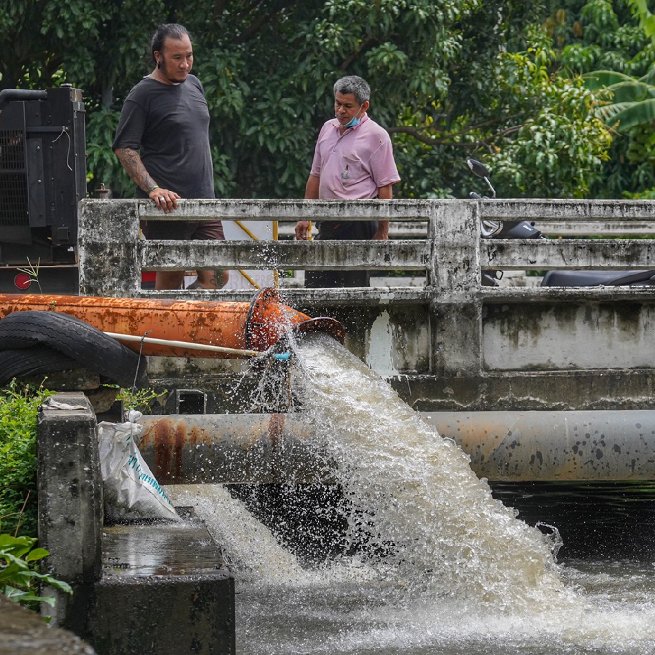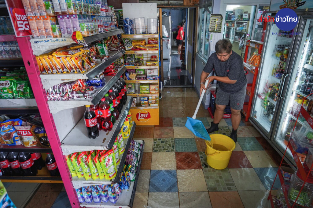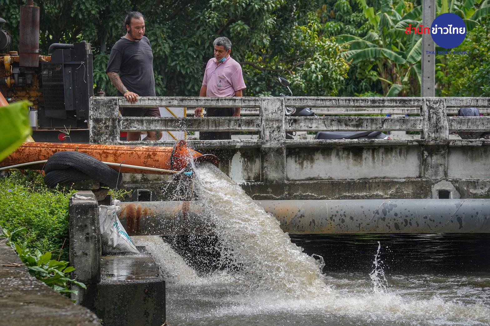 ที่คลองอาจารย์พร ซึ่งพบว่าบริเวณนี้น้ำระบายได้ช้า เพราะน้ำในคลองย่อยต่างๆ มีระดับสูง เจ้าหน้าที่เข้ามาช่วยเหลือประชาชนในชุมชนที่บ้านที่อยู่ที่ลุ่มต่ำ ถูกน้ำท่วมเข้าบ้านตั้งแต่เมื่อคืนนี้ ก็ออกมาทำความสะอาด เก็บกวาด สูบน้ำที่เหลือออกจากบ้าน