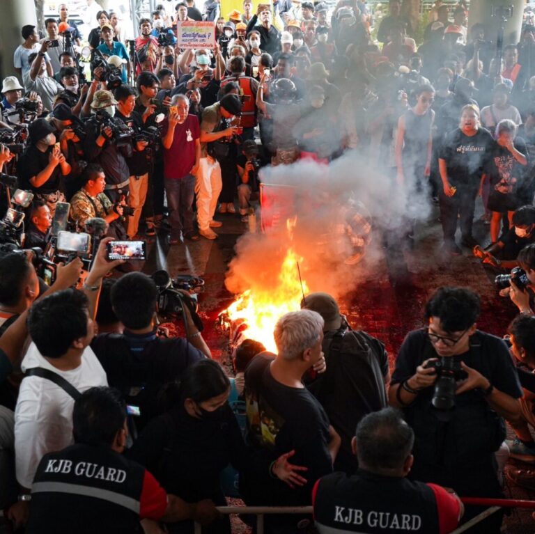 บุกพรรคเพื่อไทย จุดไฟเผาหุ่นผ้า