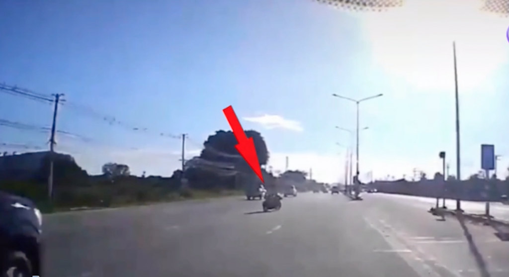 คลิปวินาทีสุดหวาดเสียว รถยนต์ขับอยู่บนถนนสายมาบเอียง-ปิ่นทอง 2 อำเภอหนองขาม จังหวัดชลบุรี ขับมาในเลนขวาด้วยความเร็ว ทันใดนั้นมีรถจักรยานยนต์คันนี้ขี่ข้ามถนนมาแบบประมาท ตัดหน้ารถยนต์ที่ขับมาทางตรงในเลนขวา เพื่อหวังจะกลับรถ ทางคนขับรถยนต์ก็ตกใจ เบี่ยงหลบย้อนศรข้ามฝั่งถนน ขณะเกิดเหตุไม่มีรถยนต์ขับสวนมา ไม่อย่างนั้นอาจจะเกิดอุบัติเหตุรุนแรงได้ โดยในภายหลังคนขี่รถจักรยานยนต์รู้ว่าเขาเป็นฝ่ายที่ประมาท จึงขี่รถตามมาขอโทษเจ้าของคลิป.-สำนักข่าวไทย