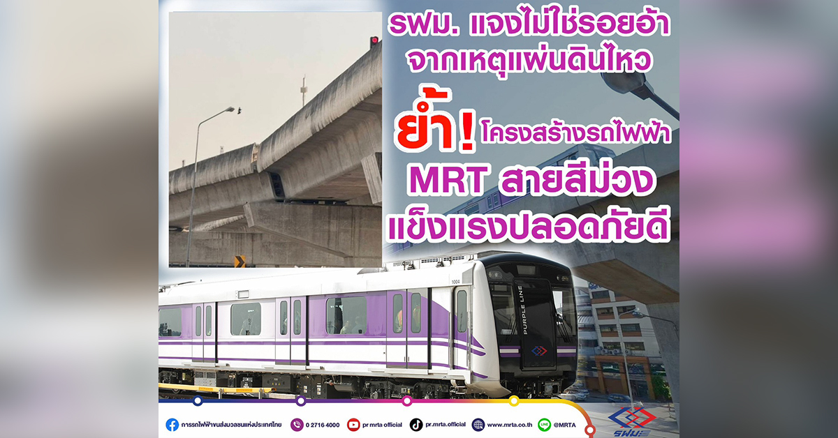 การรถไฟฟ้าขนส่งมวลชนแห่งประเทศไทย (รฟม.) ขอเรียนว่า บริเวณดังกล่าว เป็นช่วงโครงสร้างทางวิ่งที่มีการขยายกว้างขึ้นในจุด Pocket Track ซึ่งเป็นพื้นที่สำหรับกลับขบวนรถไฟฟ้าเพื่อให้บริการต่อ ระหว่างสถานีสะพานพระนั่งเกล้าและสถานีแยกนนทบุรี 1 ซึ่งไม่ใช่การเคลื่อนตัวจากเหตุแผ่นดินไหวแต่อย่างใด รวมถึงจากการตรวจสอบและประเมินความมั่นคงแข็งแรงของโครงสร้างสถานี ทางวิ่ง ระบบรางและงานระบบอื่นๆ ที่เกี่ยวข้อง ไม่พบสิ่งผิดปกติ