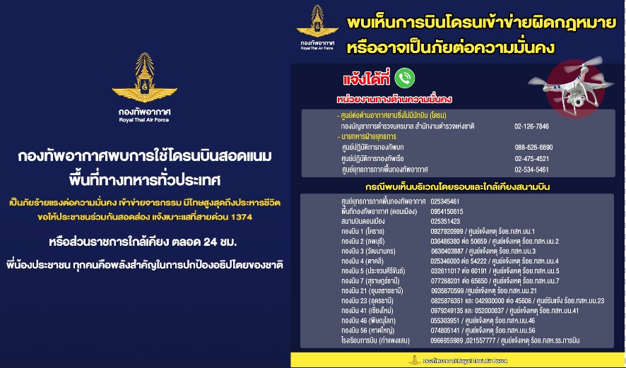 ปัจจุบัน สถานการณ์ความขัดแย้งระหว่างไทย กัมพูชา ยังคงต้องเฝ้าระวัง โดรนคือภัยคุกคามที่ร้ายแรงและส่งผลกระทบต่อความมั่นคงและชีวิตประชาชน กองทัพอากาศจึงขอความร่วมมือประชาชนทุกท่านที่พบเห็นหรือทราบเบาะแสเกี่ยวกับการบินของโดรน รวมทั้งผู้ที่บังคับโดรน ที่อาจฝ่าฝืนกฎหมายได้แจ้งสายด่วนความมั่นคง 1374 หรือหน่วยงานราชการใกล้เคียง ได้ตลอด 24 ชั่วโมง. – 313 สำนักข่าวไทย