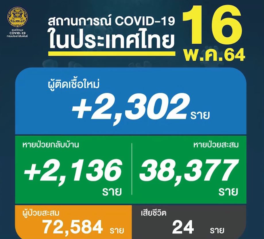 ยอดผู้ติดเชื้อโควิด-19 วันนี้อยู่ที่ 2,302 คน โดยไม่มีรายงานตัวเลขผู้ติดเชื้อจากเรือนจำหรือสถานที่กักขัง อย่างไรก็ตาม ยอดผู้ติดเชื้อวันนี้ทำให้ในระลอกเมษายน มีผู้ติดเชื้อสะสม 72,584 คน แต่หากรวมยอดผู้ติดเชื้อสะสมตั้งแต่เริ่มการระบาด พบว่าขณะนี้ประเทศไทยมีผู้ติดเชื้อเกิน 100,000 คนแล้ว เพราะยอดติดเชื้อสะสมของเมื่อวาน (15 พ.ค.) อยู่ที่ 99,145 คน หากรวมกับยอดติดเชื้อวันนี้จะเท่ากับ 101,447 คน