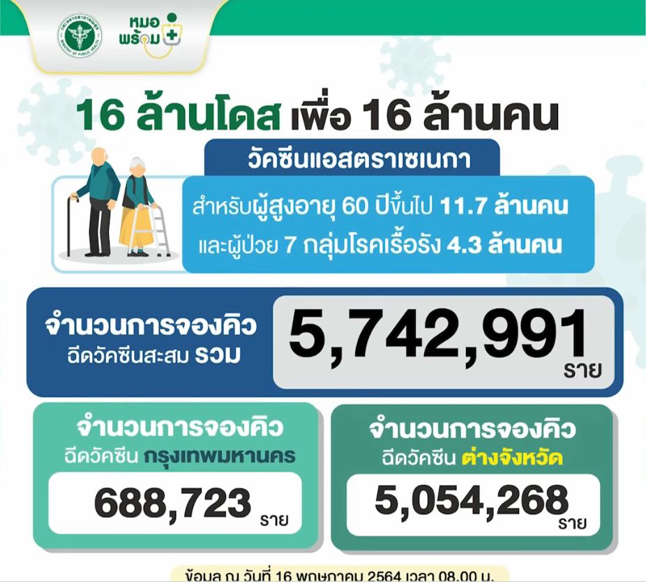 สำหรับการลงทะเบียนจองวัคซีนสำหรับผู้สูงอายุ 60 ปีขึ้นไป และบุคคลที่มีโรคประจำตัว 7 กลุ่มผ่านไลน์, แอปฯ “หมอพร้อม” และหน่วยงานสาธารณสุขใกล้บ้าน ปรากฏว่าเพจ “หมอพร้อม” โพสต์ว่า การจองวัคซีนในเดือนมิถุนายน มีผู้จองวัคซีนเต็มจำนวนที่ได้รับจัดสรร กรุณาจองคิวในเดือนกรกฎาคมป็นต้นไป ซึ่งมีวัคซีนสำหรับ 5 ล้านคน/เดือน