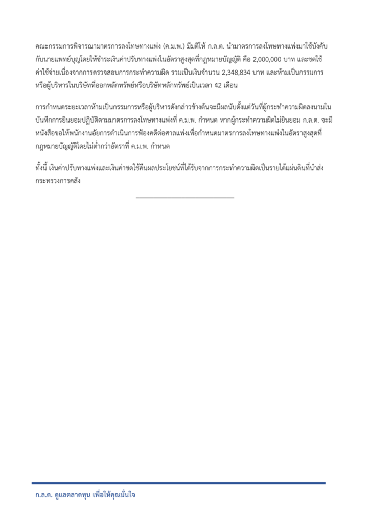 กรุงเทพฯ 26 ส.ค. – ก.ล.ต.ใช้มาตรการลงโทษทางแพ่งกับผู้บริหาร THG กรณีเผยแพร่ข้อความที่อาจก่อให้เกิดความสำคัญผิดเกี่ยวกับผลการดำเนินงานและราคา THG