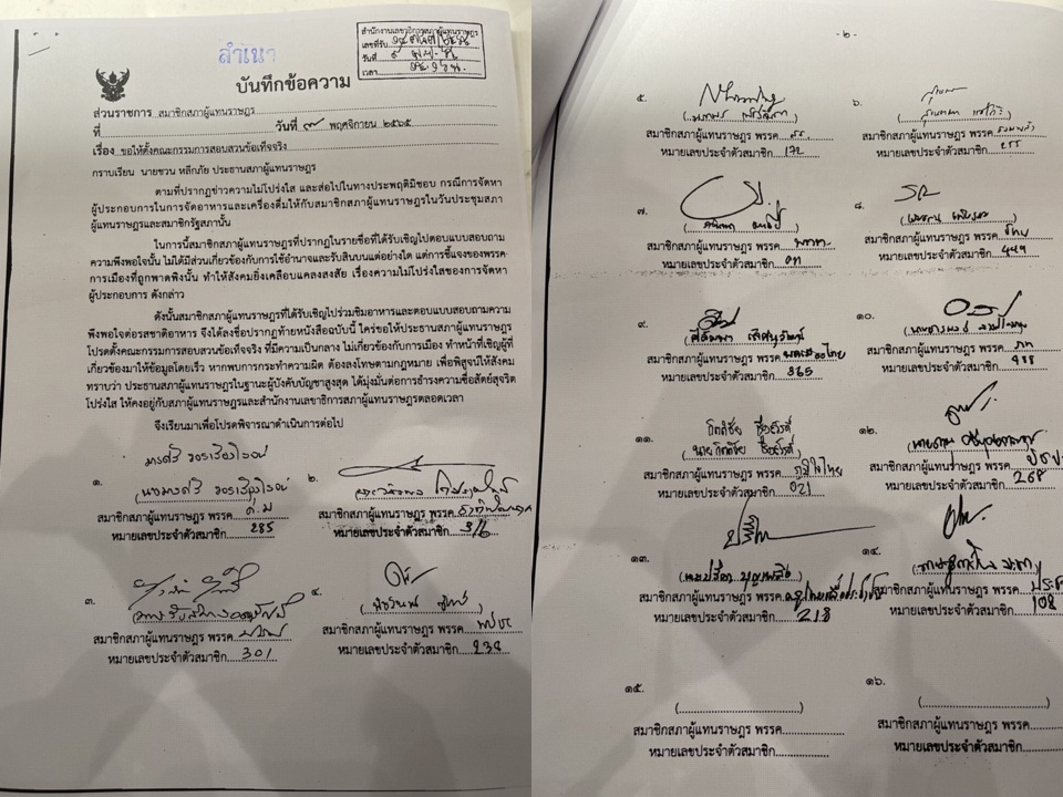 ดังนั้นสมาชิกสภาผู้แทนราษฎรที่ได้รับเชิญไปตอบแบบสอบถาม ซึ่งปรากฏรายชื่อท้ายหนังสือฉบับนี้ ใคร่ขอให้ประธานสภาผู้แทนราษฎรโปรดตั้งคณะกรรมการสอบสวนข้อเท็จจริงที่มีความเป็นกลาง ไม่เกี่ยวข้องกับการเมือง ทำหน้าที่เชิญผู้ที่เกี่ยวข้องมาให้ข้อมูลโดยเร็ว หากพบการกระทำความผิด ต้องลงโทษตามกฎหมาย เพื่อพิสูจน์ให้สังคมทราบว่า ประธานสภาผู้แทนราษฎรในฐานะผู้บังคับบัญชาสูงสุด มุ่งมั่นต่อการธำรงความซื่อสัตย์สุจริตให้คงอยู่กับสภาผู้แทนราษฎรและสำนักงานเลขาธิการสภาผู้แทนราษฎรตลอดเวลา จึงเรียนมาเพื่อโปรดพิจารณาดำเนินการต่อไป.-สำนักข่าวไทย