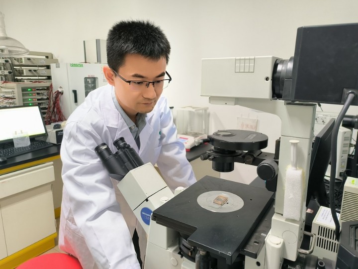 (ภาพจากมหาวิทยาลัยจี้หนาน : หวังจี๋จ้วง หนึ่งในนักวิจัยชั้นนำจากมหาวิทยาลัยจี้หนาน ใช้กล้องจุลทรรศน์สังเกตหุ่นยนต์ขนาดเล็ก ที่สามารถกำจัดไมโครพลาสติกและนาโนพลาสติกออกจากน้ำ วันที่ 22 พ.ย. 2022)