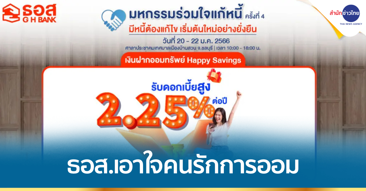 กรุงเทพฯ 18 ม.ค. – ธอส. จัดเงินฝากออมทรัพย์ Happy Savings อัตราดอกเบี้ยสูงสุด 2.25% ต่อปี เอาใจคนรักการออม ในงานมหกรรมร่วมใจแก้หนี้ฯ ครั้งที่ 4 จ.ชลบุรี