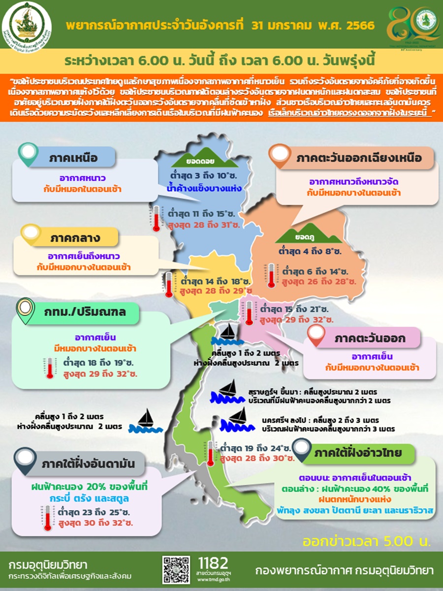 กรมอุตุฯ 31 ม.ค. – กรมอุตุฯ เผยทั่วไทยอากาศหนาวเย็น มีหมอกบางในตอนเช้า ขณะที่ภาคใต้ตอนล่างมีฝนตกหนักบางแห่ง อ่าวไทยคลื่นลมแรง เรือเล็กควรงดออกจากฝั่ง