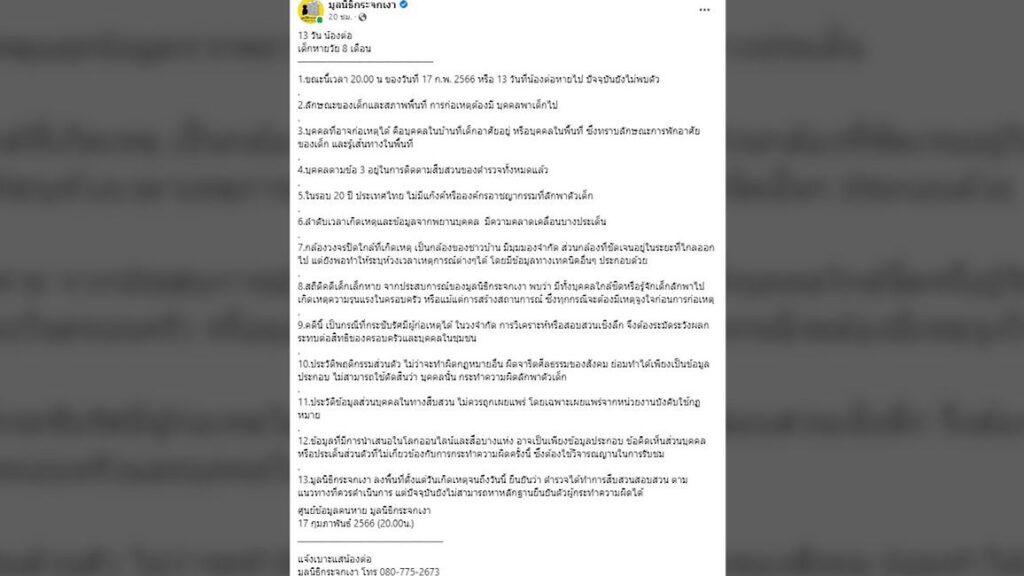 ด้านมูลนิธิกระจกเงาโพสต์เฟซบุ๊กถึงกรณีการหายตัวไปของน้องต่อ ระบุตอนหนึ่งว่า คดีนี้เป็นกรณีที่กระชับรัศมีผู้ก่อเหตุได้ในวงจำกัด การวิเคราะห์หรือสอบสวนเชิงลึก จึงต้องระมัดระวังผลกระทบต่อสิทธิของครอบครัวและบุคคลในชุมชน ประวัติพฤติกรรมส่วนตัว ไม่ว่าจะทำผิดกฎหมายอื่น ผิดจารีตศีลธรรมของสังคม ย่อมทำได้เพียงเป็นข้อมูลประกอบ ไม่สามารถใช้ตัดสินว่าบุคคลนั้นกระทำความผิดลักพาตัวเด็ก ประวัติข้อมูลส่วนบุคคลในทางสืบสวนไม่ควรถูกเผยแพร่ โดยเฉพาะจากหน่วยงานบังคับใช้กฎหมาย ข้อมูลที่มีการนำเสนอในโลกออนไลน์และสื่อบางแห่ง อาจเป็นเพียงข้อมูลประกอบ ข้อคิดเห็นส่วนบุคคล หรือประเด็นส่วนตัว ที่ไม่เกี่ยวข้องกับการกระทำความผิดครั้งนี้ ซึ่งต้องใช้วิจารณญาณในการรับชม พร้อมย้ำแจ้งเบาะแสน้องต่อได้ที่มูลนิธิกระจกเงา โทร.08 0775 2673 .-สำนักข่าวไทย